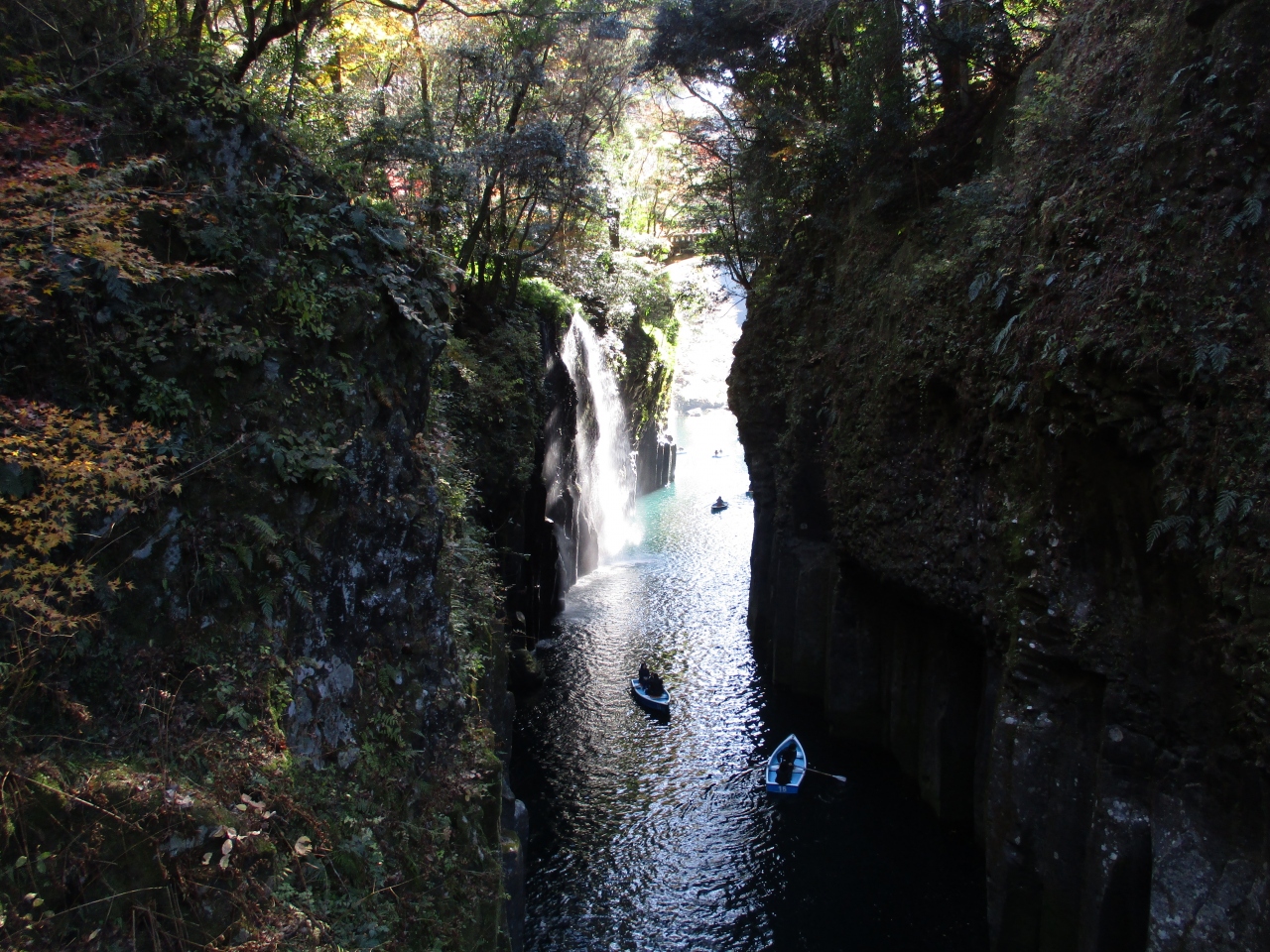 高千穂峡の最終目標は、やはり真名井の滝になるのでしょうか。橋の上からの景色も良いですが、やはりボートを借りて、いろいろな方向や距離を工夫して眺めるのがいいです。ボート操作の腕もある程度必要となりますがそれは二の次です。高千穂峡に来たら、まず、ボートの予約をしましょう。