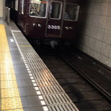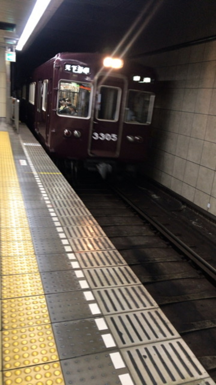 北浜駅から乗車。オールロングシートの阪急車両、混雑していて座れず。
