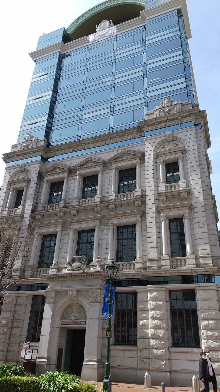 2022年3月に立ち寄りました。みなとみらい線馬車道駅出口から徒歩1分ほど、馬車道通り沿いにあるビルになります。今からちょうど100年前の1922年に川崎銀行横浜支店として建てられた建物で、ファサード工法によって当時の外観を残したまま建て替えられています。そのため、建物の上層階と下層階では外観が全く異なっており、非常にユニークな建物となっています。当時の横浜の街並みを残す大変貴重な建物ですね。