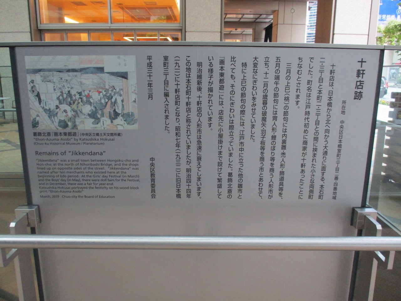 日本橋室町センタービルのエントランス部分に、案内板が立てられていました。この辺りが昔は十軒店と呼ばれていたことを記した案内板でした。長屋が十軒あって、江戸時代には賑わっていた場所ですが、時代が移っても買い物客などが集まる場所として、今でも変わりはないと思いました。