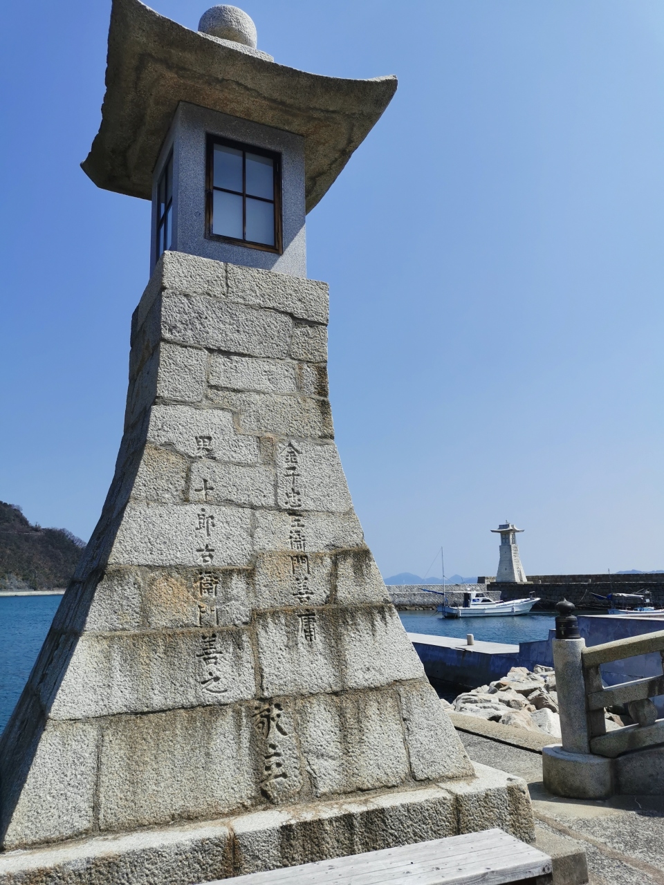 御手洗伝統的建造物群保存地区の無料駐車場は街を抜けた5分ほど先にあります。駐車場から街に向かう途中、千砂子波止がありました。石でできた防波堤。江戸時代に整備されたとの事です。今でも石畳で整備されています。防波堤の先頭とたもとには石灯籠があって、江戸風情を感じます。