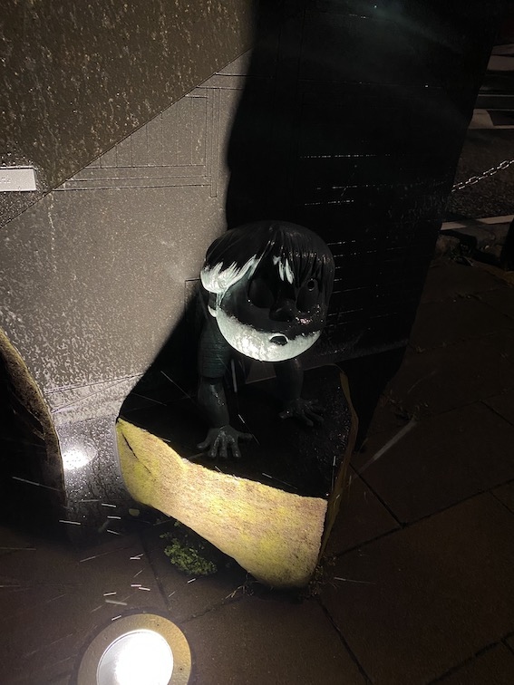 境港駅から続く商店街のメインストリート沿いに、数多くのブロンズ像が並んでいます。有名キャラや妖怪はもちろん、すぐには名前がでてこないような妖怪もいて、ひとつひとつ見て回るのも楽しい。夜は商店街の店が閉まってしまいますが、ライトアップもあり、夜の散歩も楽しめます。