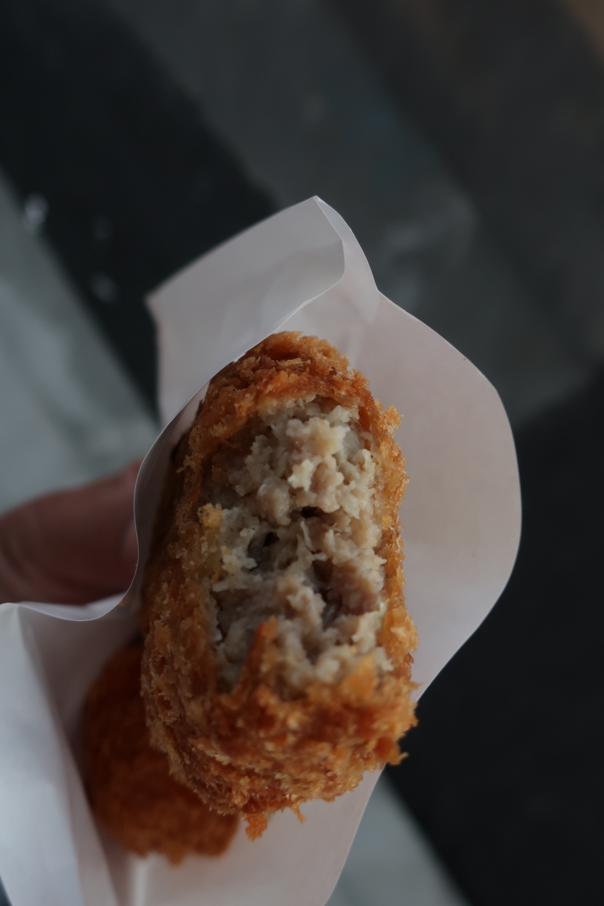 1日中東京散策で歩き回って最後に十条銀座の商店街にたどり着きました。小腹が空いたので惣菜屋さんで何か買って立ち食いしようと思い、このお店でメンチカツとかにクリームコロッケを購入。化にクリームコロッケはほんのり温かい程度でしたが、メンチカツは熱々で素晴らしく美味しかったです。たぶんメンチカツが売れ筋商品なのでしょう。