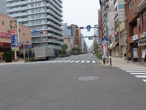 西隣の堺筋は北行き一方通行、松屋町筋は南行き一方通行