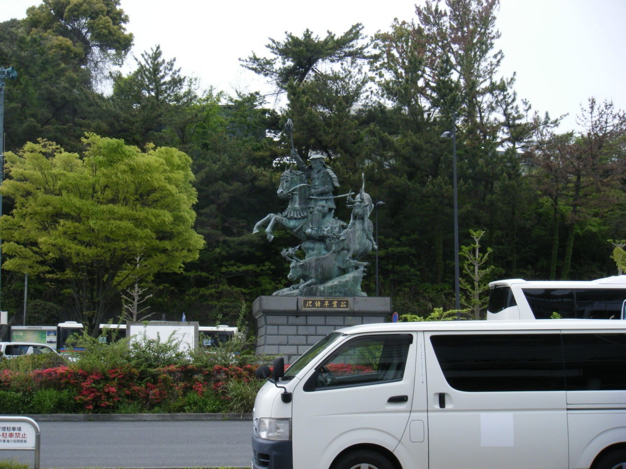 2022年4月に立ち寄りました。小田原駅西口を出るとロータリーがありますが、そのど真ん中に巨大な像が置かれています。これが北条早雲像になります。北条早雲は室町時代から戦国時代にかけて活躍した武将で、小田原城を拠点に関東一円を治めていました。小田原駅に像があるのは納得ですね。非常に大きな像ですが、ロータリーのど真ん中にあって、近づくのがちょっと大変でした(裏手に横断歩道があります)。