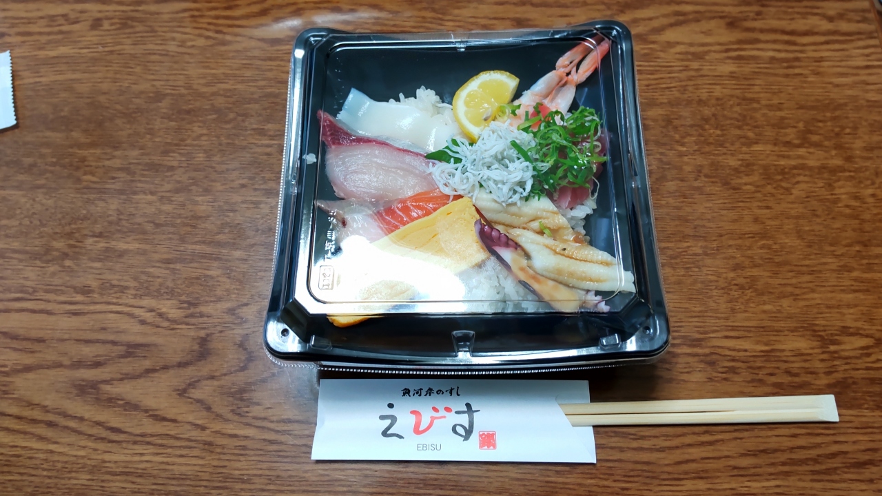 山陽電車の西代駅の近くにあるえびすです。前回、ランチで食べた海鮮丼が美味しかったので、今回はテイクアウトしました。作り置きではないので、注文してから5分くらい待ちました。寿司飯に多くのネタがのった美味しい海鮮丼でした。醤油、わさびは2セット入っていました。ランチセットと異なり、あら汁はありませんでした(写真参照)。昼食で食べるのであれば、ランチのセットの方がお得です。