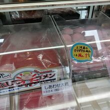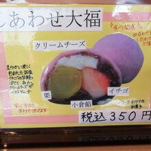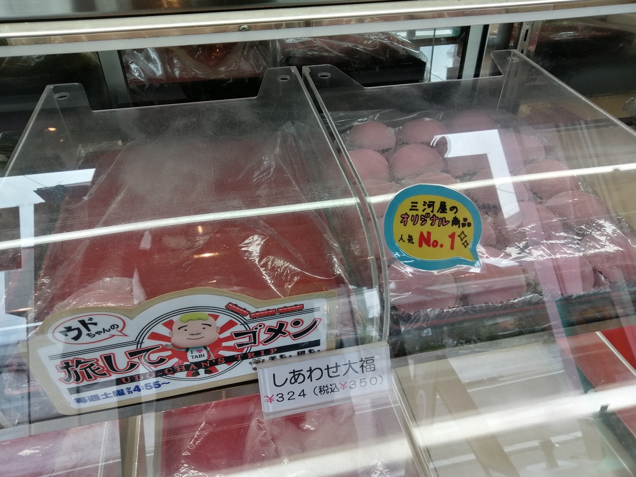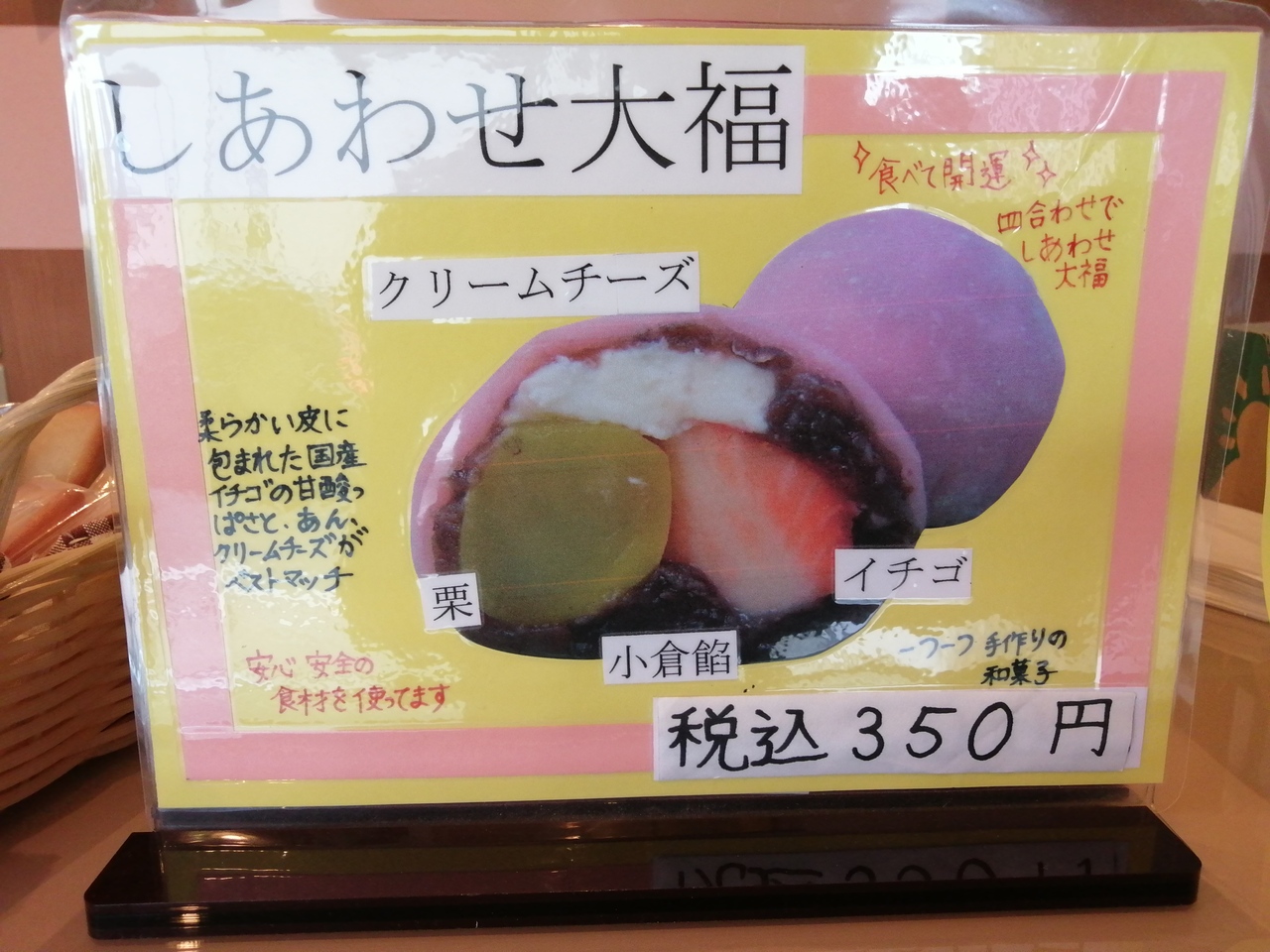 さて何にしようか…と目についたのが「ウドちゃんの旅してゴメン」(わかる人にはわかると思います)のステッカーの貼られた「しあわせ大福」。しかもポップには“人気No.1”の文字。1個350円(税込)とちょっとお高いですがこれは買うしかないでしょう。