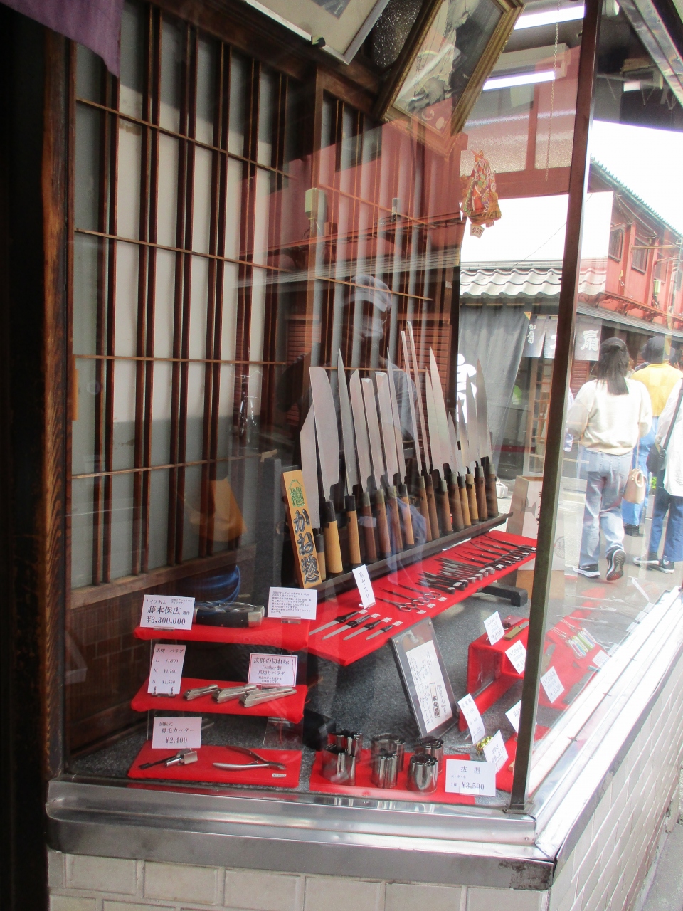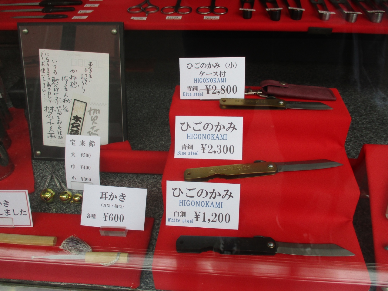 仲見世通りから脇に入ったところに、刃物の専門店があったので立ち寄ってみました。プロが使いそうな立派な包丁は用途に応じて大きさなどが違っていました。また子供のころ駄菓子屋で買って遊んだ小型ナイフのひごのかみの青銅製があって、本物は品質も価格も全然違っていると思いました。