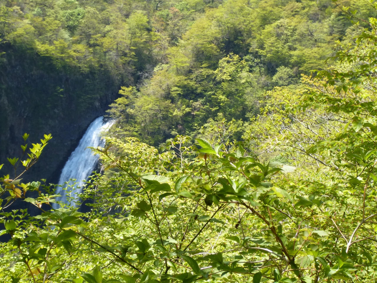 蔵王のお釜を観光後、エコーラインを宮城方面に向かって走りました。駒草平展望の後、右手石造りの不動尊が見えてきて、その先に不動池の展望台があります。不動滝は、蔵王山中でも最も規模の大きい滝です。緑の多い季節のためか、滝は滝壺に向かう一部しか見えませんが、水量の多さは実感できます。案内板によると、カニとウナギが住み家争いをしたという伝説があるそうです。