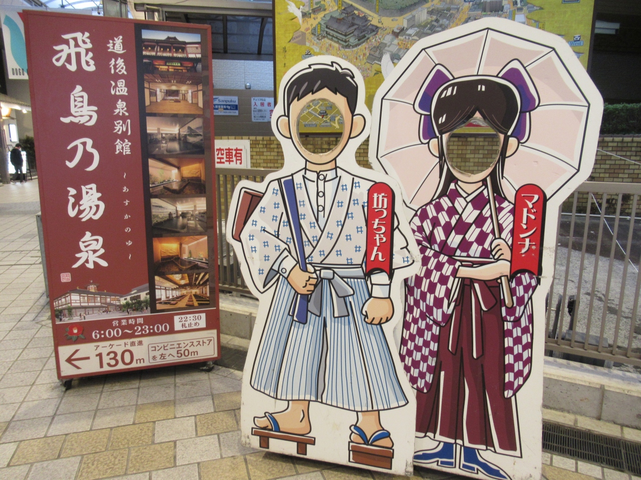 伊予鉄道・路面電車の道後温泉駅からすぐそばなので、ホテルまでぶらぶら見ながら行けて、いきなり道後温泉気分に浸れます。20時過ぎに夜の散策に行った時には閉店している店が多かった。朝8時頃帰る時もまだほとんど開いてませんでした。