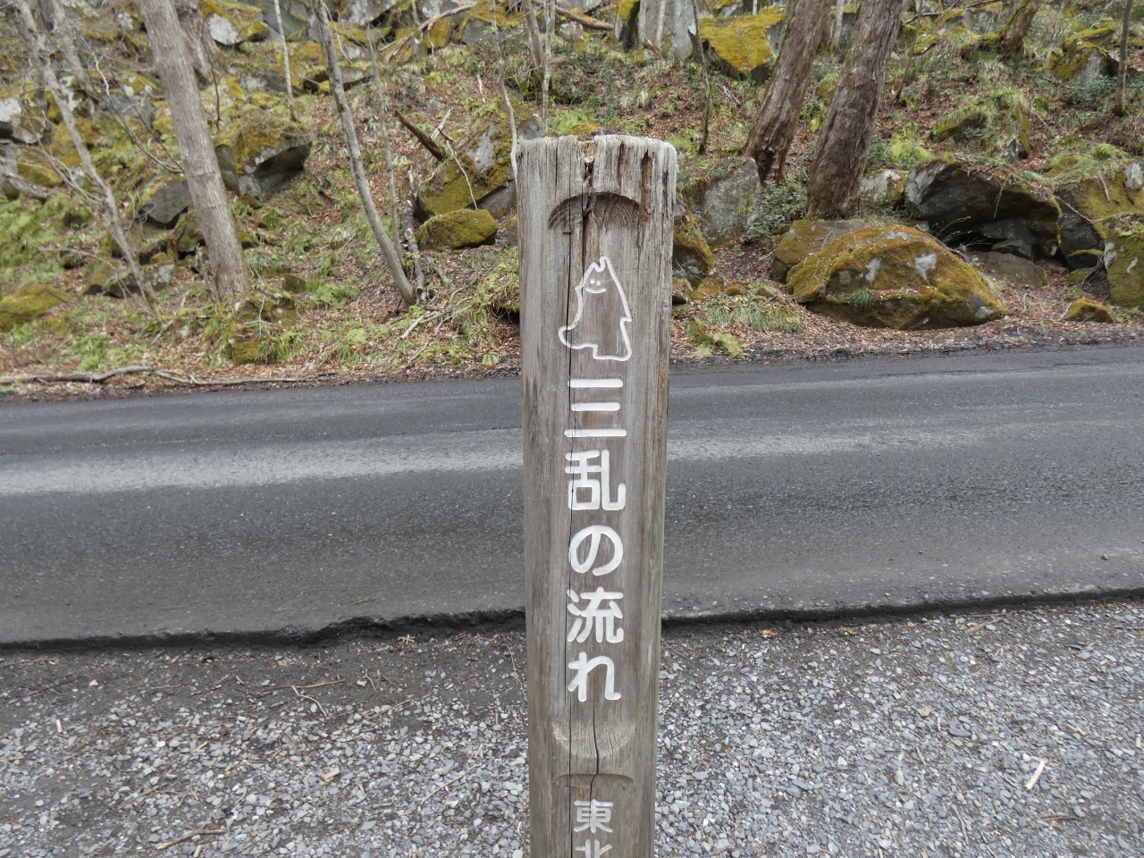 奥入瀬渓流の代表的な流れで三乱の流れ(さみだれのながれ)。石ヶ戸休憩所の北方で渓流沿いに案内板が立っています。1つだった流れが3つに分かれる様から付いた名で、春には苔むした岩の上に花々が咲くそうです。新緑の中の美しい流れです。