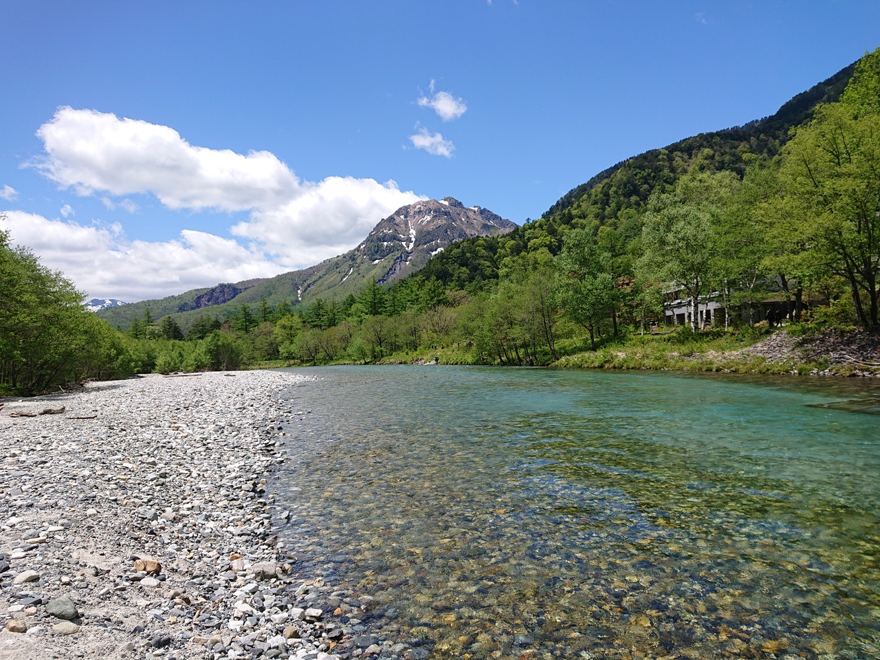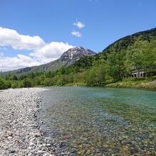 コバルトブルーの川越しの焼岳や穂高岳も素敵です。
