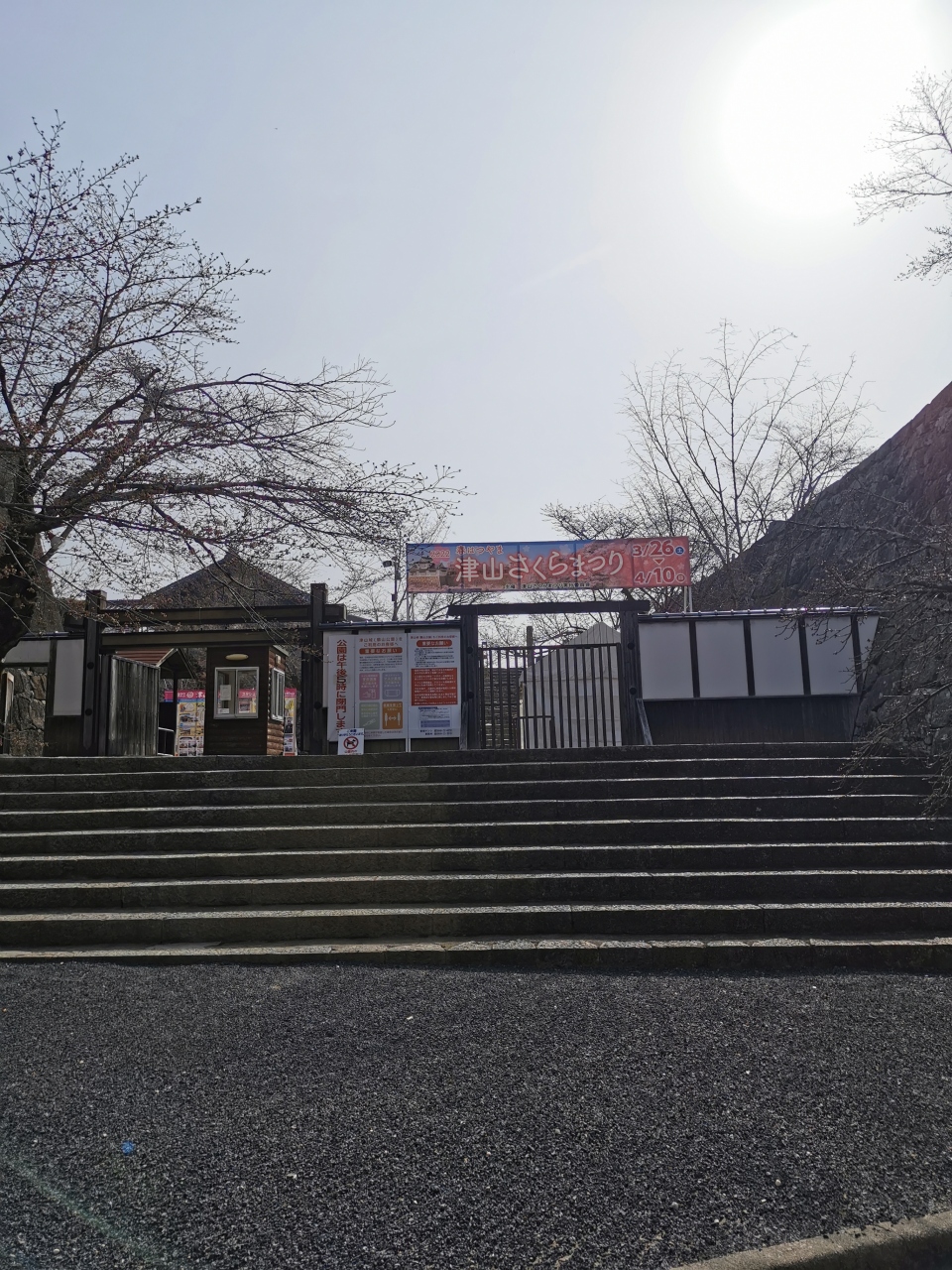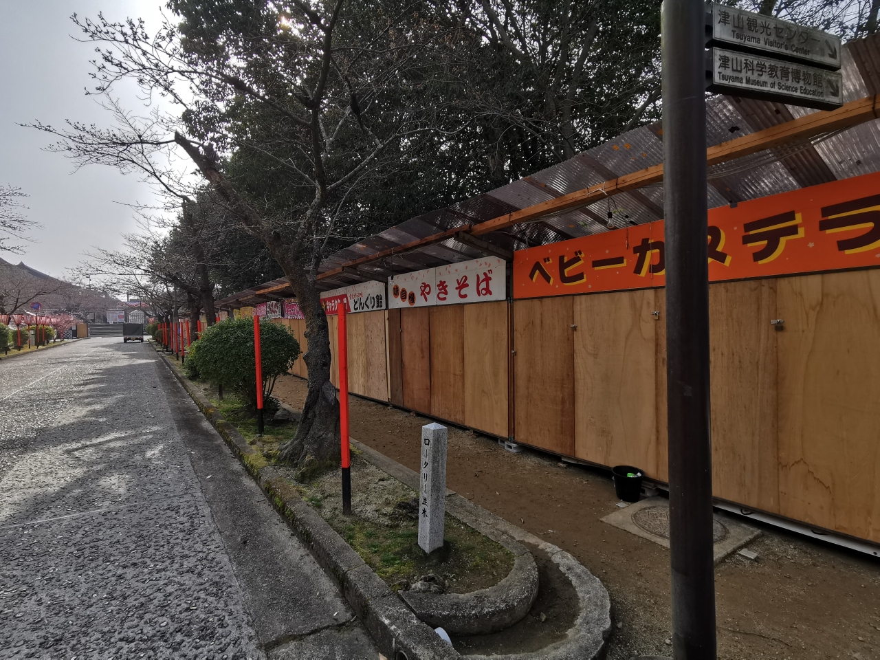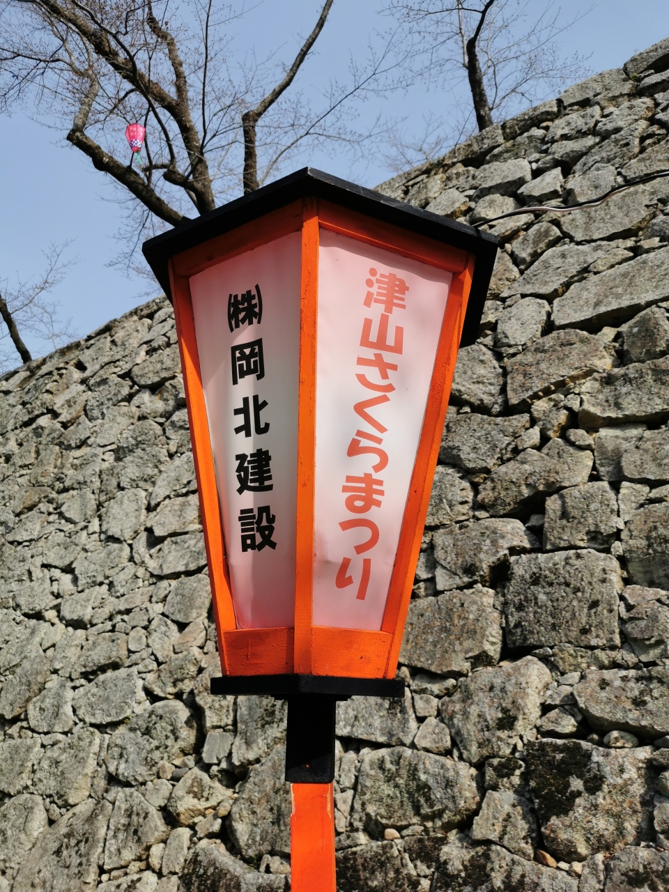 津山城址のある鶴山(かくざん)公園で行われる「さくらまつり」は規模も大きくてとても有名なお祭りと聞いています。訪れた日は数日後かに「さくらまつり」が開始される日でした。さくらはまだ2部咲きと言ったところでした。ずでに準備があい整いさくらまつりの提灯と多数出店が並んでいました。早朝で人は少ないですが、とても賑やかな雰囲気でした。