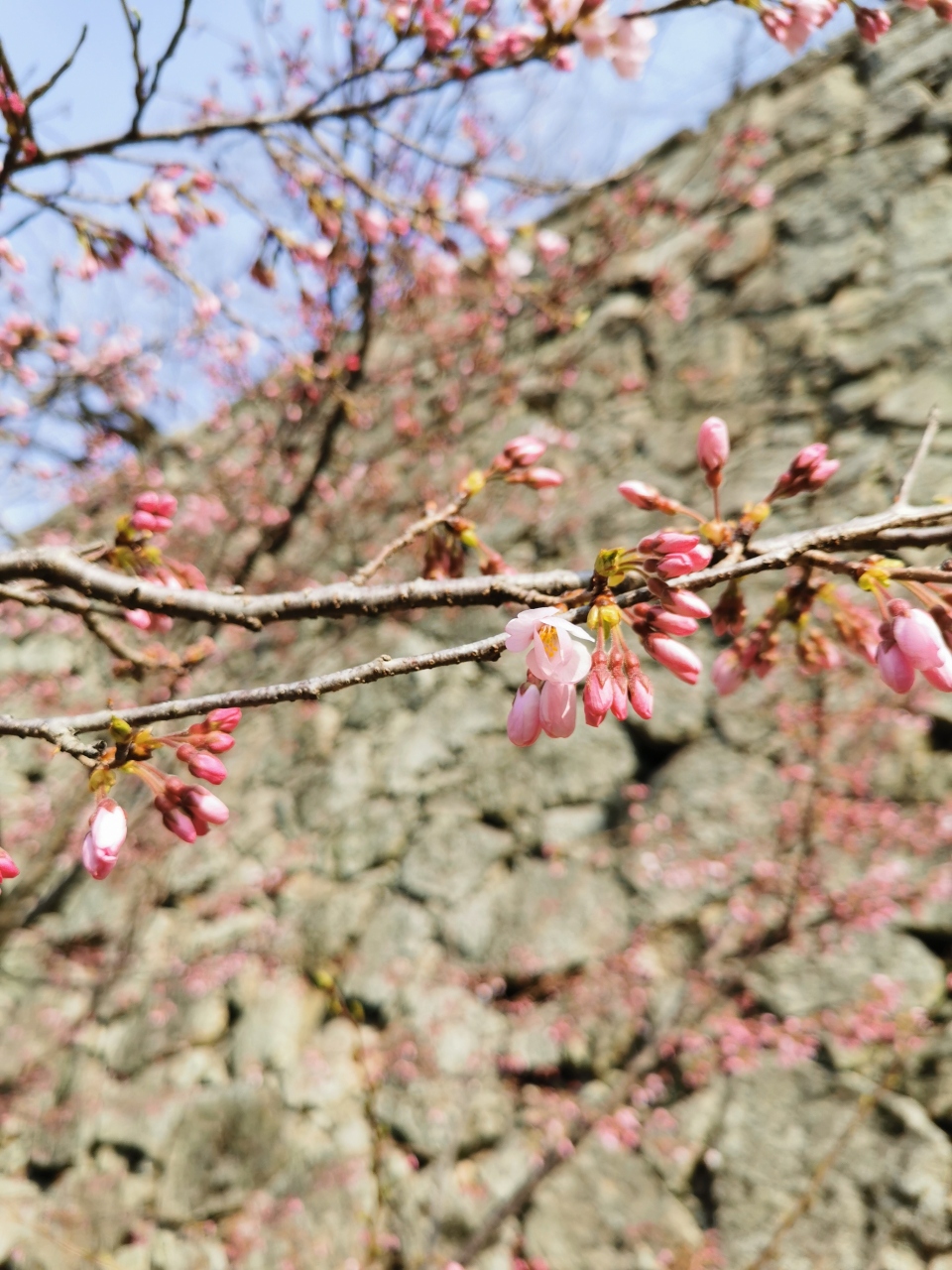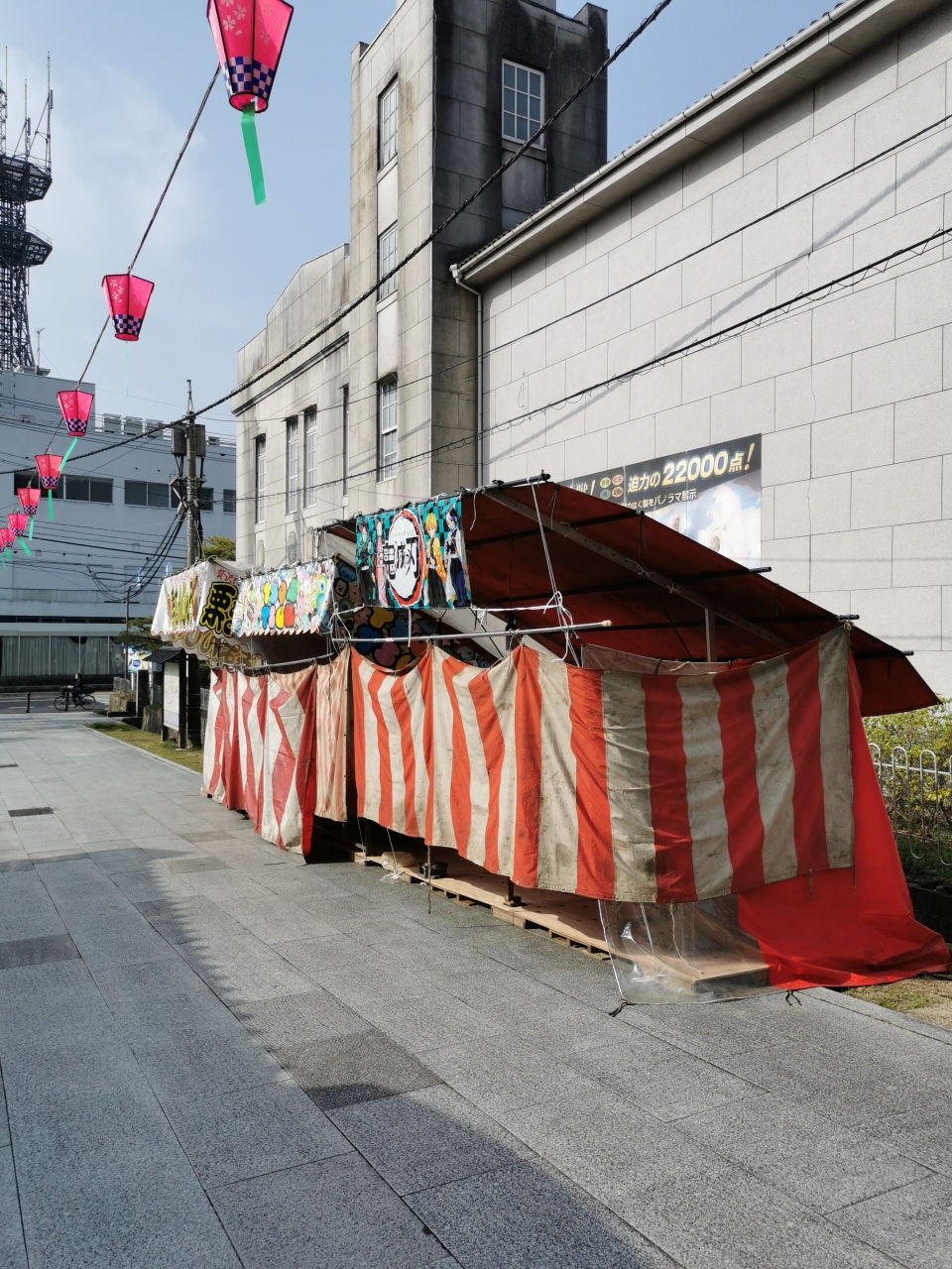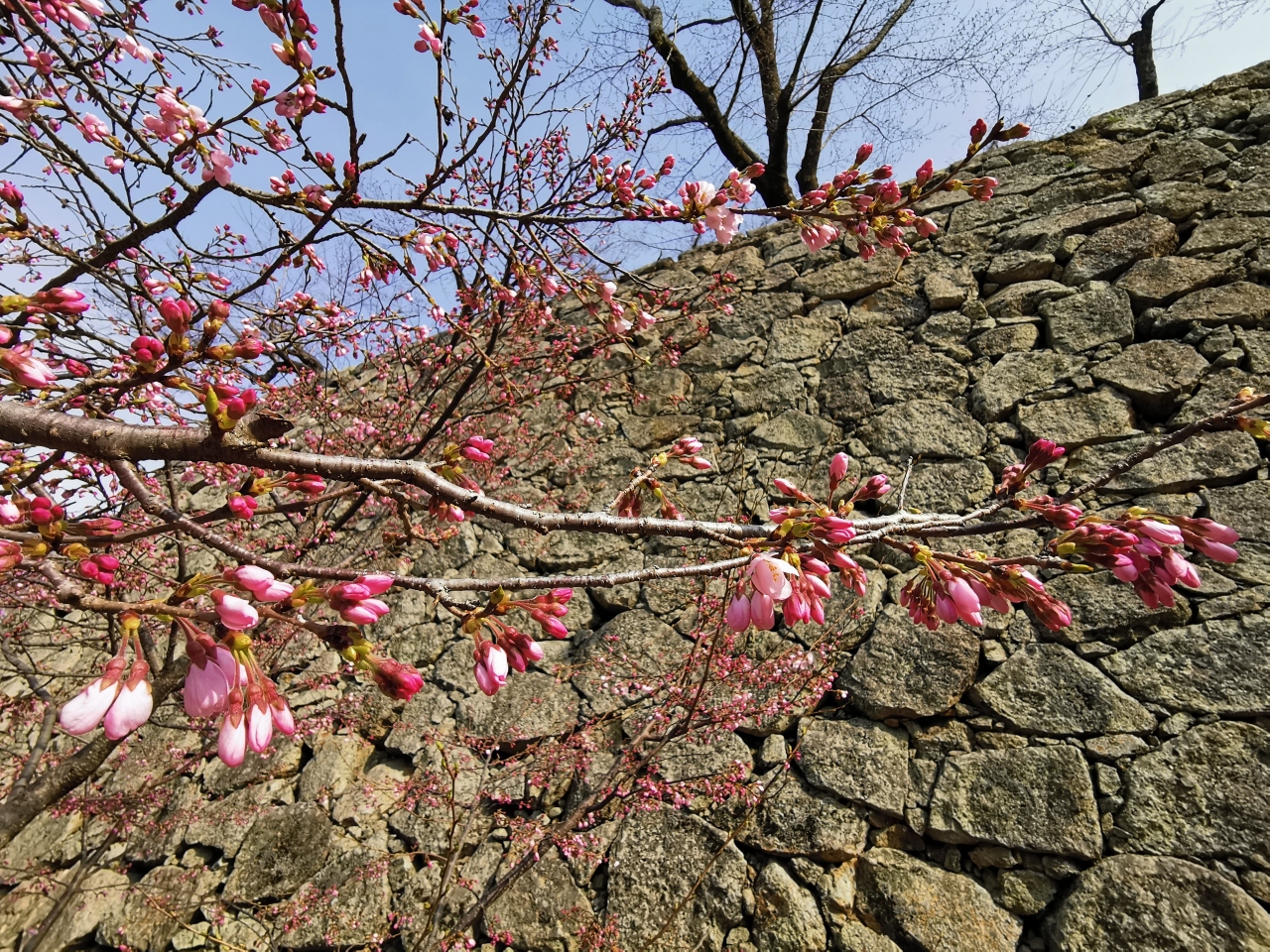 津山城址のある鶴山(かくざん)公園で行われる「さくらまつり」は規模も大きくてとても有名なお祭りと聞いています。訪れた日は数日後かに「さくらまつり」が開始される日でした。さくらはまだ2部咲きと言ったところでした。ずでに準備があい整いさくらまつりの提灯と多数出店が並んでいました。早朝で人は少ないですが、とても賑やかな雰囲気でした。