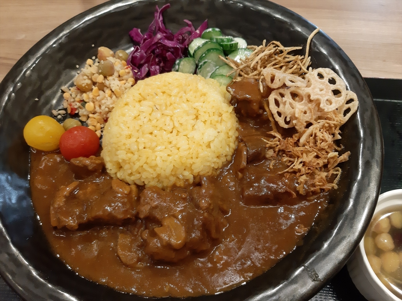 見た目がエスニック且つ華やかな盛り付けで、付け合わせ野菜の色々な歯応えや味が楽しい一品。