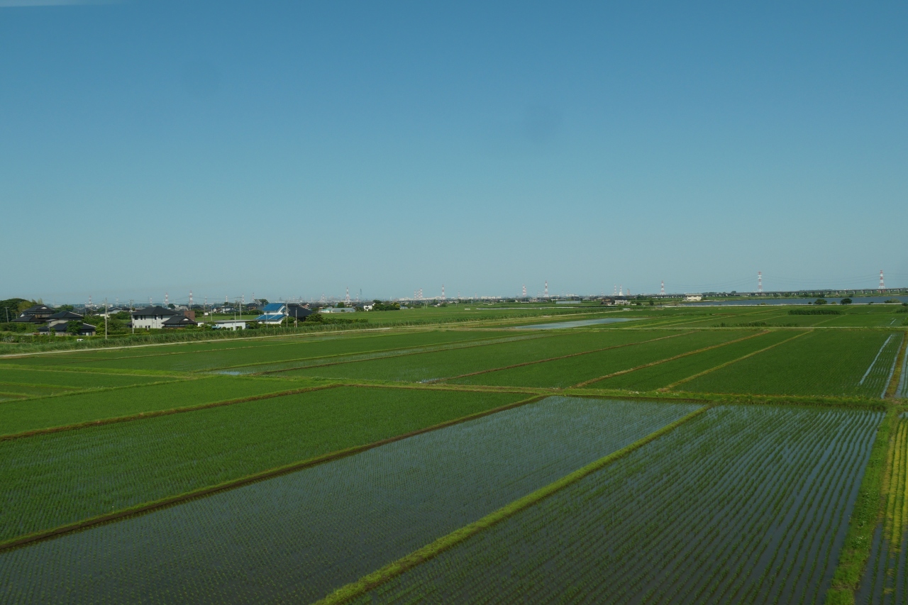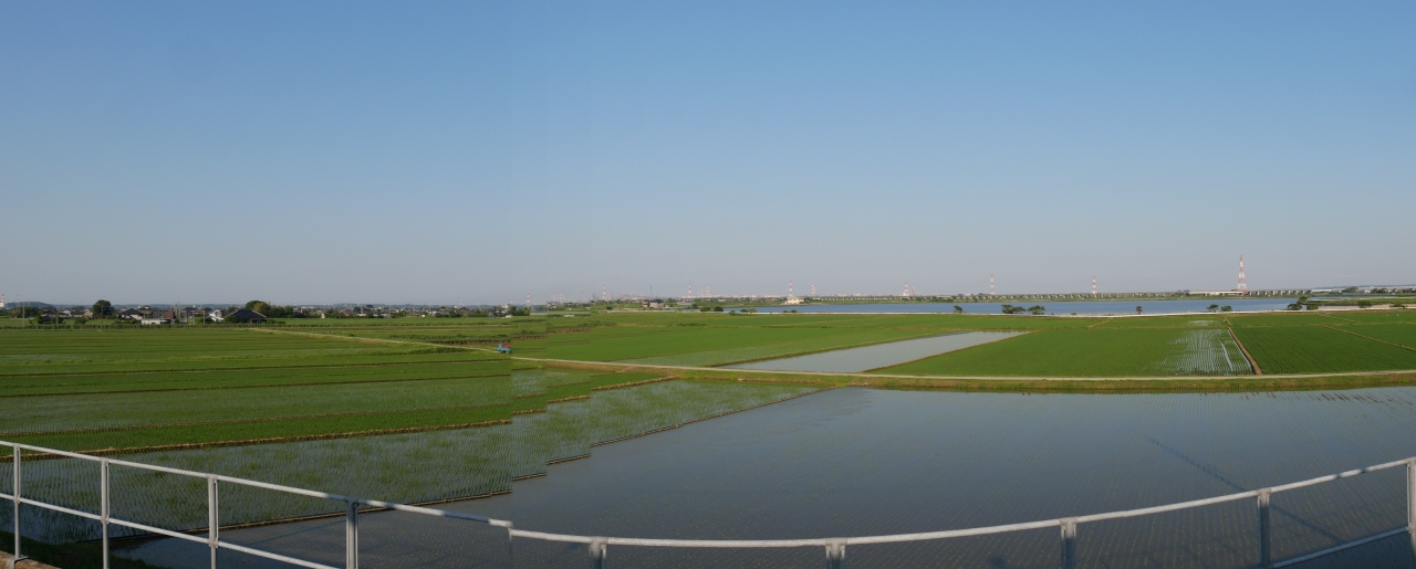 川の両側には水のはった田植えの時期の水田はとおくまで広がりとてもきれいでした。