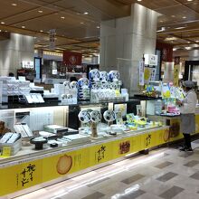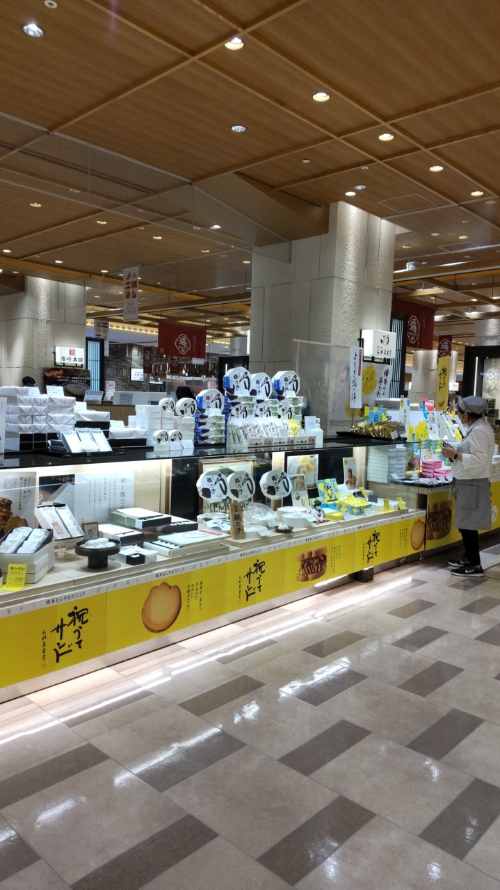 石村萬盛堂博多マイング店、こちらのお店、マシュマロの中に黄味あんが入っている鶴の子が有名です。進物として持っていくと喜ばれます。新商品ではキャラメルサンドも発売になり和菓子、洋菓子とお土産に困った時は利用しています。