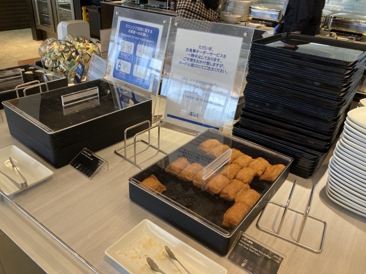 食事は軽食が多く、日本らしくおにぎりやお寿司などもあります。ビュッフェスタイルの他に、オーダー制で別メニューをオーダーすることもできます。また、アルコールの提供もあり。