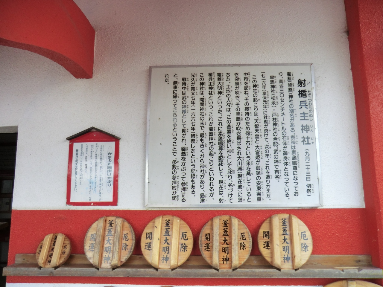 海際にある神社で、赤い鳥居や建物がきれいです。ちょっと珍しい神社で、釜のふたを頭の上にのせて、落ちないように鳥居から建物までを歩けば願いがかなうということで、みんな頭にちょっと思いふたをのせて一生懸命歩いていました。チェッカーズの二人もやってましたね。