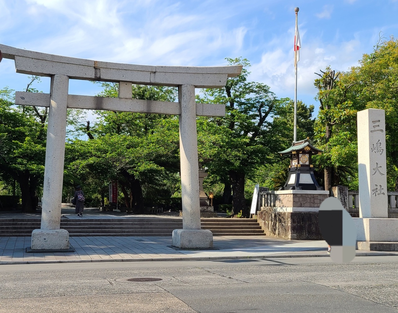 三島駅南口から歩いて6~7分、大鳥居のほうまで行くともう少しかかるかもしれません。