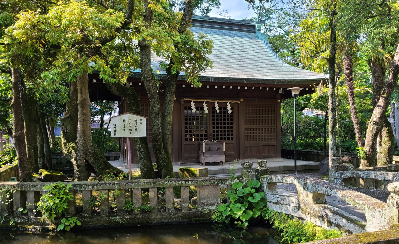 街中にもかかわらず奥へ進むと大きな池がありそれをこえてさらに奥に進むと惣門・神門・舞殿・本殿があり進むほどに静けさが増します。