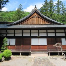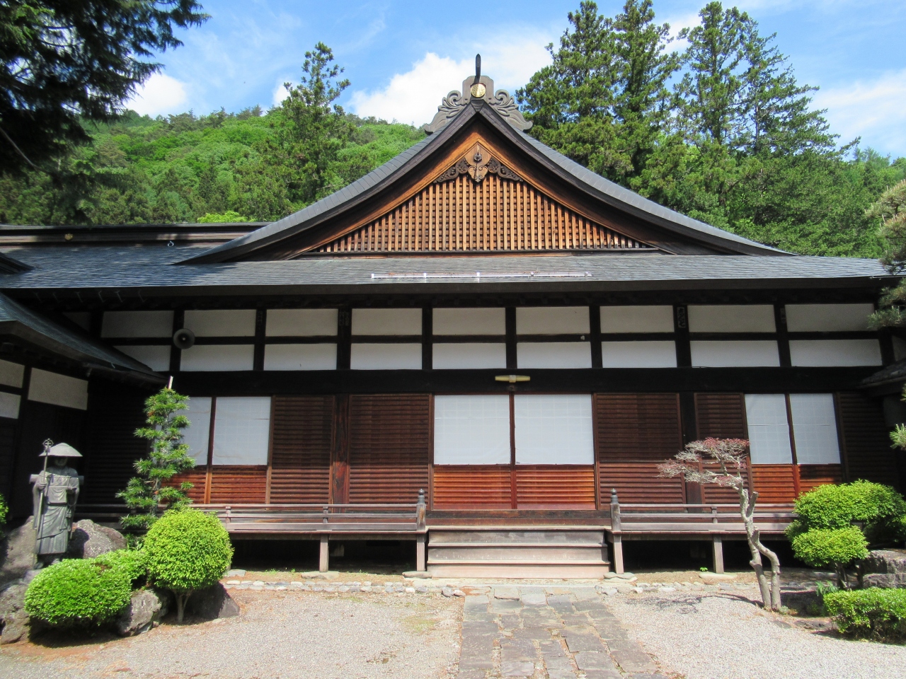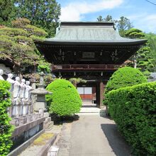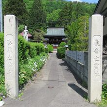 木曽十一宿の最北端にある贄川宿にあります。木曽谷に唯一残っている真言宗寺院です。19号線沿いに石柱があり、参道脇に聖観音菩薩像が線路の向こう側の町並みを見守るように立っています。本堂の前に木造銅板葺屋根の鐘楼門が建っています。手入れされた木々のある境内に障子戸の木造本堂が建っています。墓地は山の斜面に広がっていて、その奥に麻衣廼神社が建っています。共に贄川の人々との深いつながりを感じました。