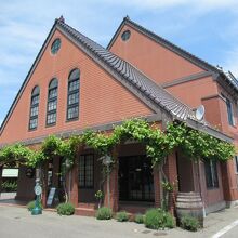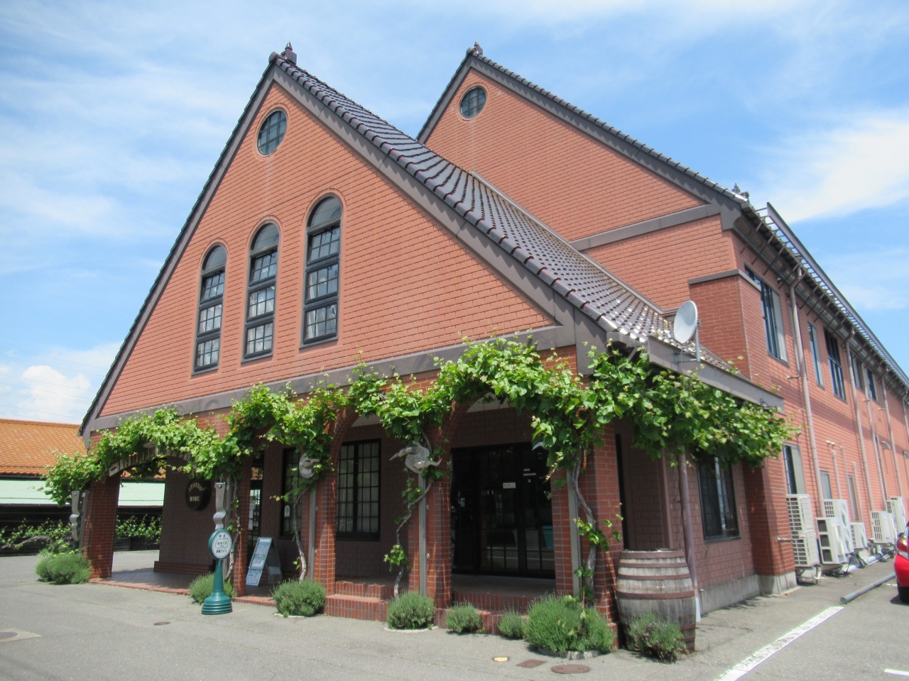塩尻ICから木曽へ向かう途中、19号線の桔梗ケ原交差点を右折した先にあります。ぶどう畑の多い地区に建つレンガの建物です。販売店の正面の柱にぶどうの木が植えられていて、アーチのように葉が茂っていました。店内に各種ワインが並び、土産用のカップワインや180㎖の飲み比べワインがあります。ワイングラス、デカンター、オープナーなどもありました。土産にコンコードのストレート果汁を購入しました。以前はワインの試飲ができましたが、コロナ禍で行っていません。残念なことです。