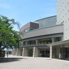 塩尻駅東口から600mほどの市役所の前にあります。1200席ほどの大ホール、400席ほどの中ホール、地下のギャラリーがある文化施設です。市役所との間の道路は桜並木で、広場にも桜があり文化会館の曲線と合わさりいい雰囲気でした。コンサートや催し物のチラシを見ると、芸術家のライブの他に市民団体の発表会などが行われていて、利用しやすいコンサートホールだとわかります。入口ロビーに県内の各ホールで近日開催されるコンサートなどのチラシもありました。市役所、総合文化センター、体育館が集まった便利な地区にある文化会館です。