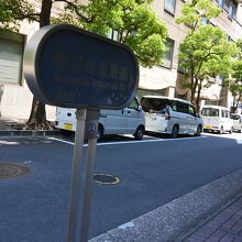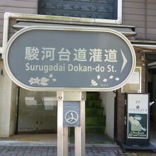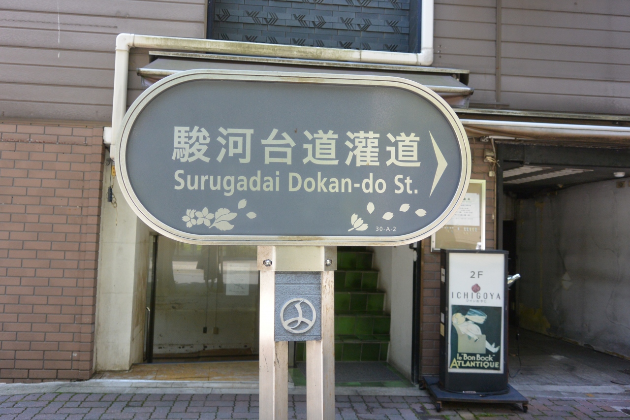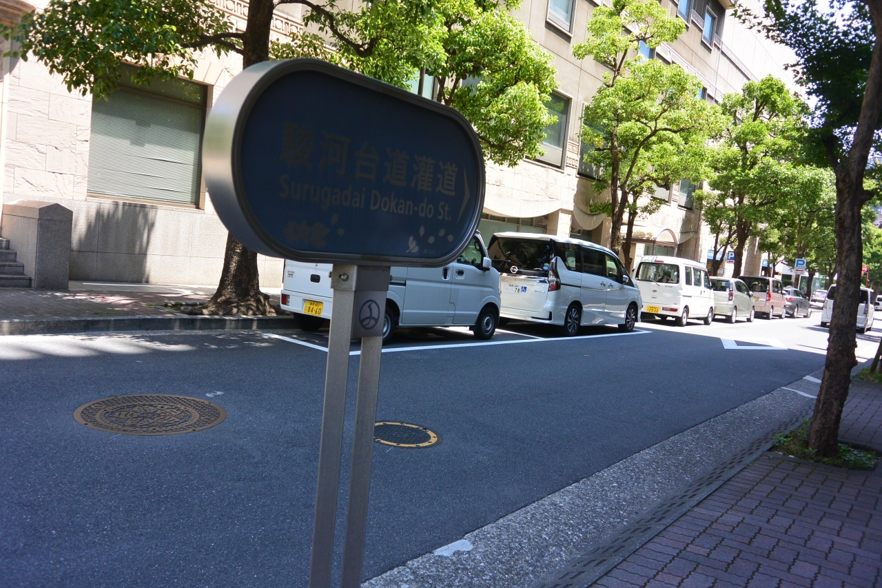 歩道上、「駿河台道灌道」の表示板に桜の絵が描かれているように、道路沿いには桜並木が整備されていて、桜の季節にはさぞかしきれいなことでしょうね。訪問時は新緑がきれいでした。道路沿いには飲食店なんかもあります。