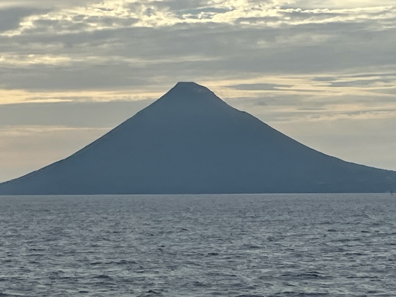 屋久島に向かうトッピーの船内から眺めました。朝はくもりで山容は霞んでいました。訪れた屋久島は雨でした。日帰りし、雨の屋久島から鹿児島に向かうにつれ、天気は回復し、指宿に着くころには見事に晴れました。逆光でしたが、開聞岳の綺麗な山並みを眺めることができました。