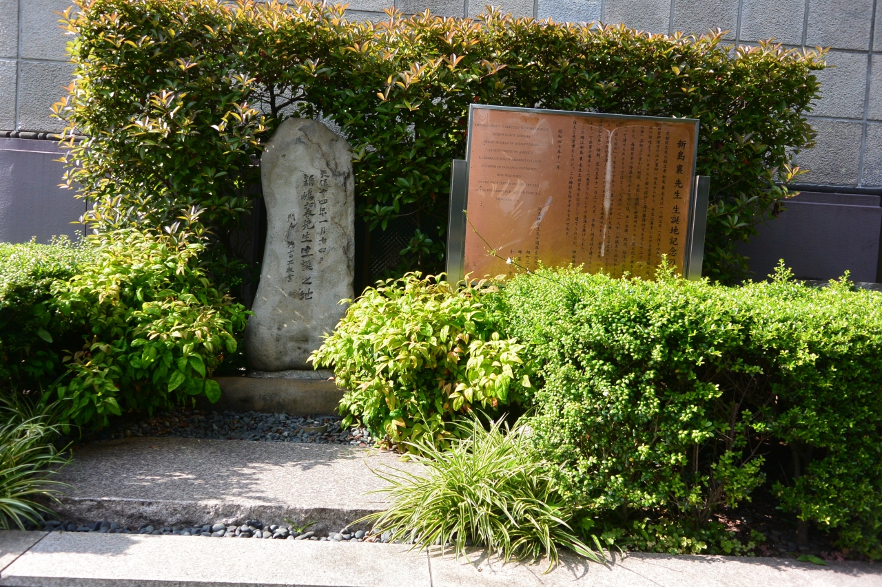 学士会館の建物の植え込みに石碑と銘板が設置してありました。同志社を創立した新島襄は上州安中藩の江戸屋敷で生まれたそうなので、その江戸屋敷がこの地にあったということですね。建物を南側に回り込んだところにあります。