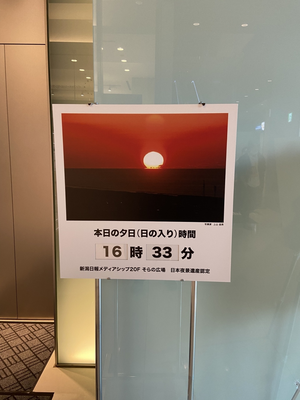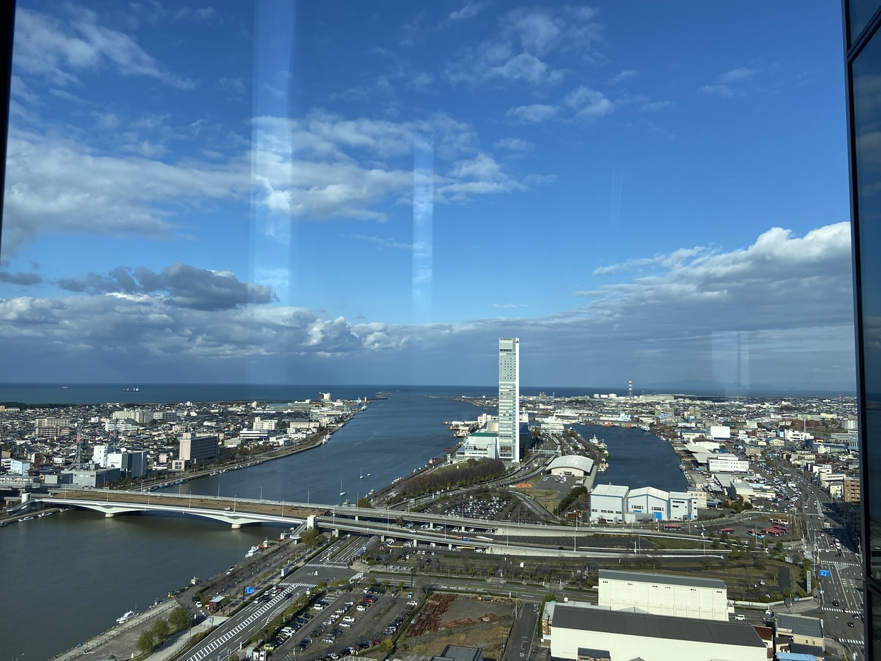 ビルの20階そらの広場を無料解放しているとのことなので寄ってみました。エレベーター前には本日の夕日時間のお知らせまであり、とても親切です。夕日の時間にはまだまだ時間があったので今回は諦めて、昼間の景色を堪能。信濃川や萬代橋など新潟市街が一望でき良かったです。