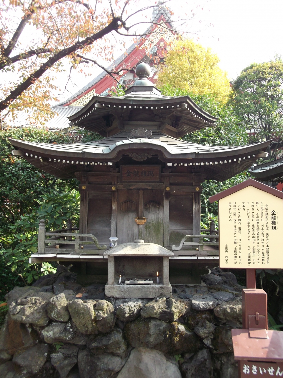 浅草寺本堂からほど近い影向堂のすぐ隣に、九頭龍権現と並んで建っているのが金龍権現です。浅草寺の山号「金龍山」に由来して奉安されたお堂で、二層になる屋根の曲線が美しいです。百尺の金龍が舞い降りて観音様をお守りした言い伝えにちなみ、年2回浅草寺の境内で「金龍の舞」が奉演されているそうです。
