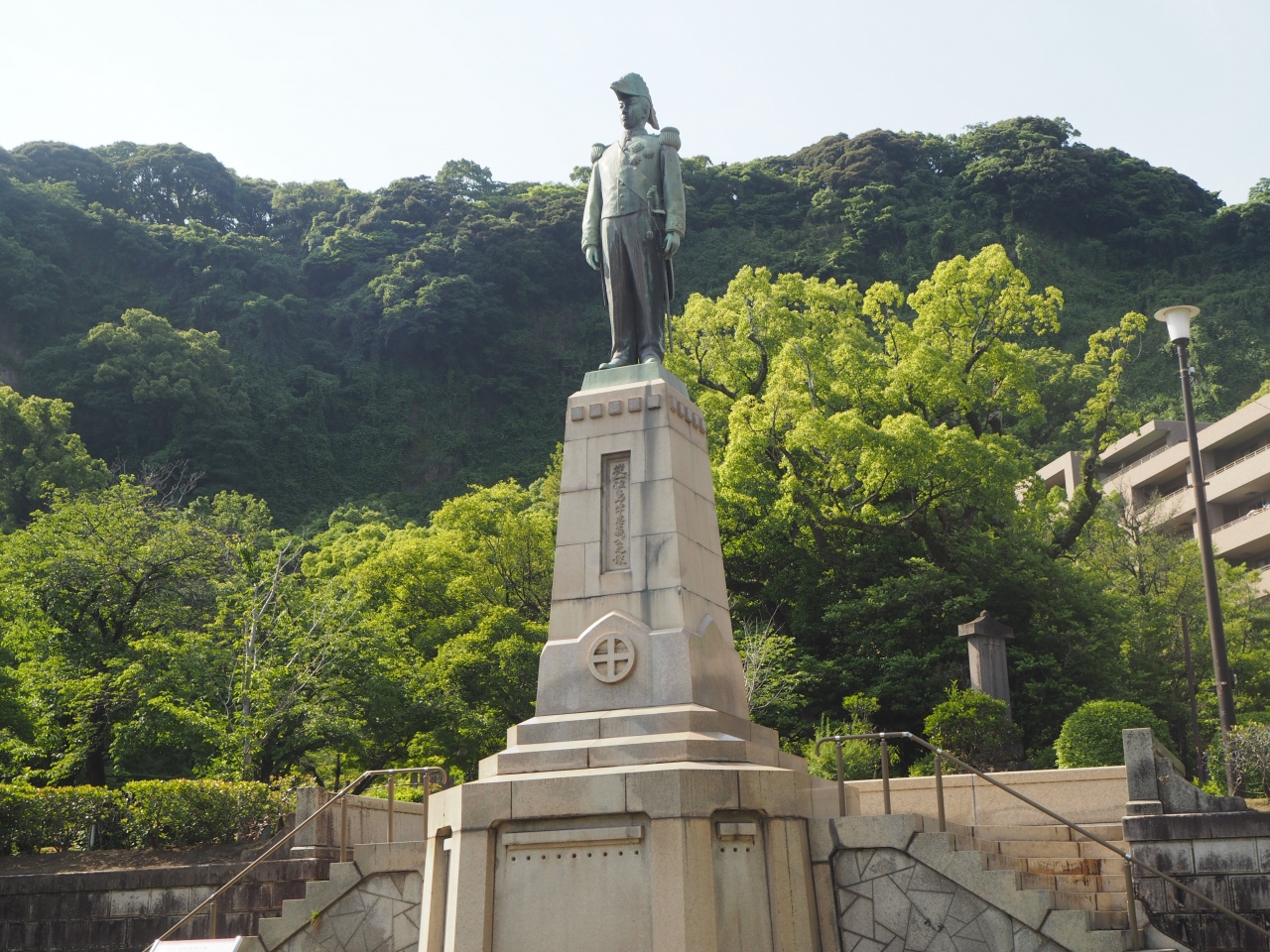 城山の麓の照国神社のとなりに探勝園跡があります。探勝園は鹿児島城の二の丸があった場所で、現在は公園になっています。公園は城山の麓というのもあり高低差があり、アップダウンが気になります。池などもあります。公園自体では行く必要はなさそうですが、島津家の3人の像(島津忠義、島津久光、島津斉彬)があるのが見どころのようです。