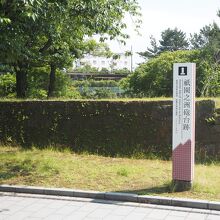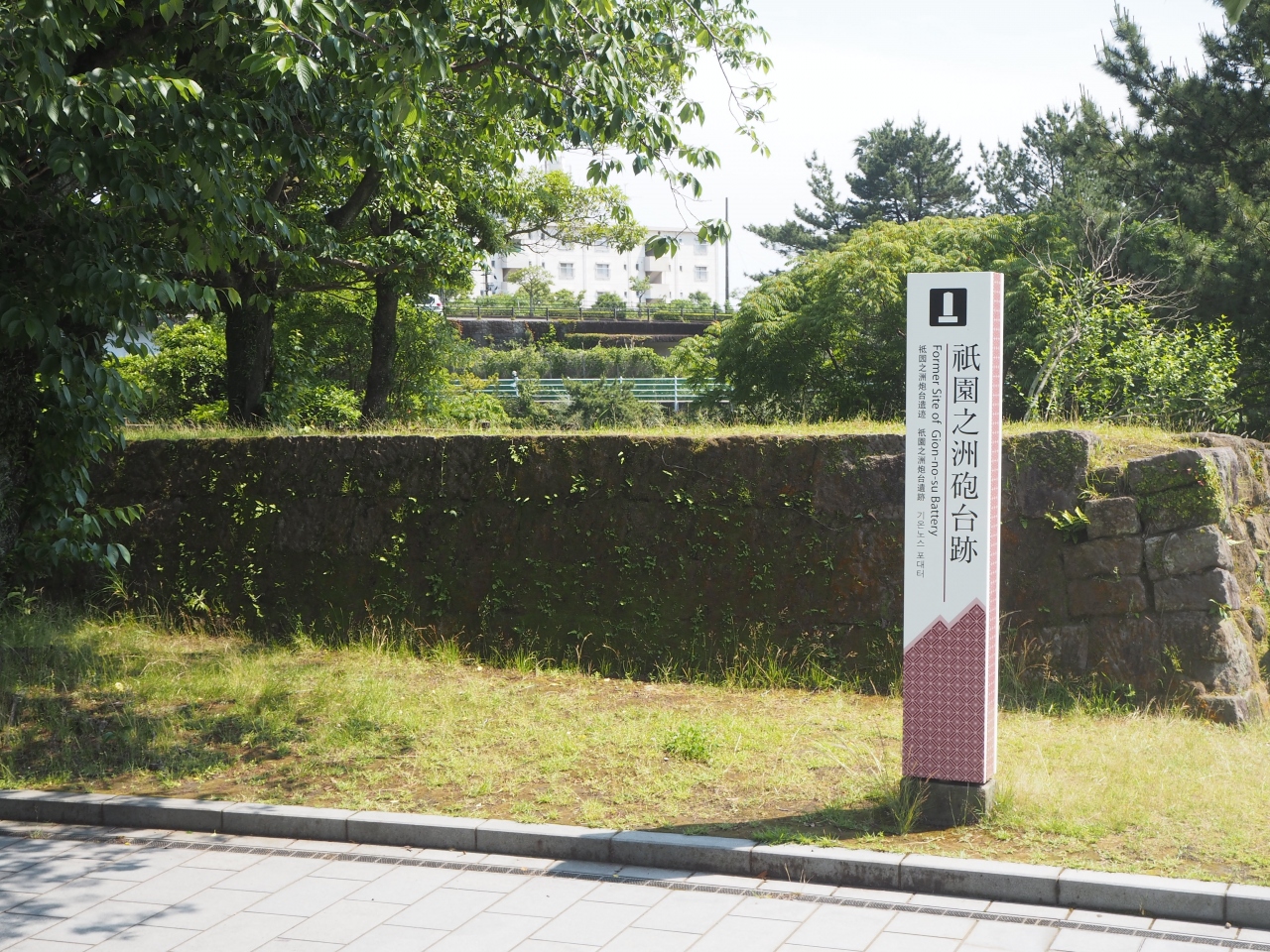 石橋記念公園のとなりの祇園之洲公園を歩いていると見かけたものです。1メートル弱ほどの石垣で囲まれた高くなった場所があり、ここが祇園之洲砲台跡です。特に大砲とかの砲台跡を疑わせるものは何もありません。薩英戦争での砲台場所として造られたもののようです。当時はここが海岸線であったようです。