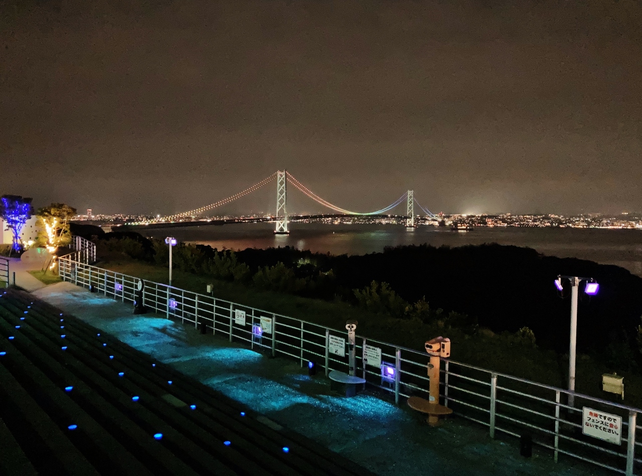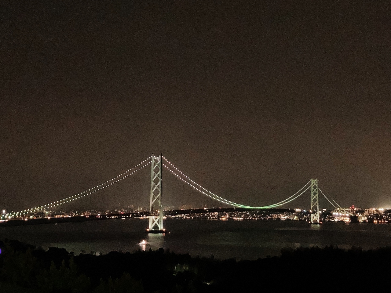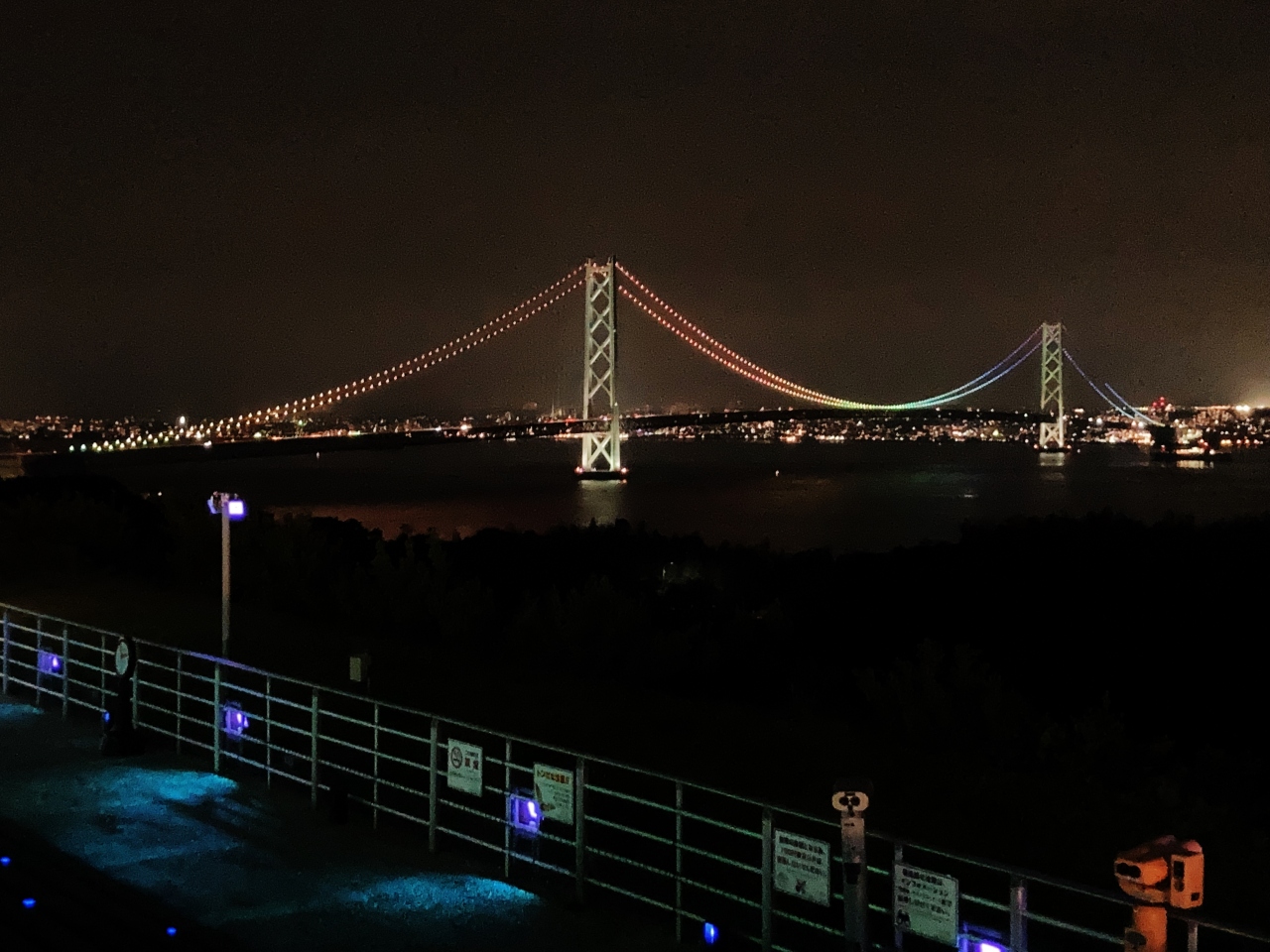 日没から23時まで(土日祝は24時まで)は明石海峡大橋がライトアップされるが、標準のライトアップ以外に、00分と30分には照明が変わるので面白い。