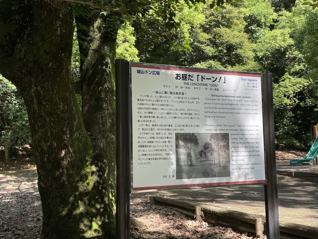城山の山頂、展望台とは別に広場があります。薩摩軍本営跡であった広場で碑が立っています。ドンとは正午の時報を伝えるために大砲を使って行っていたため大砲のドーンです。木々に囲まれた今はなにもない広場です。