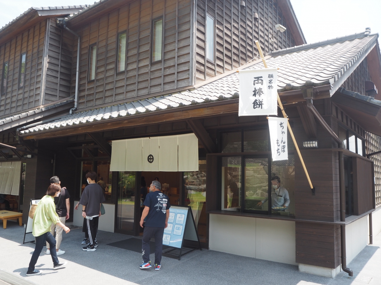 仙厳園のショッピングエリアの入口の近い場所に両棒(じゃんぼ)屋があります。2つの棒に刺さったそれぞれの餅にたれが付けられたものです。たれは醤油、みそ味、きなこがあります。餅は大きくはないのでぺろりと食べれます。日持ちしないのでお土産には向かないようです。