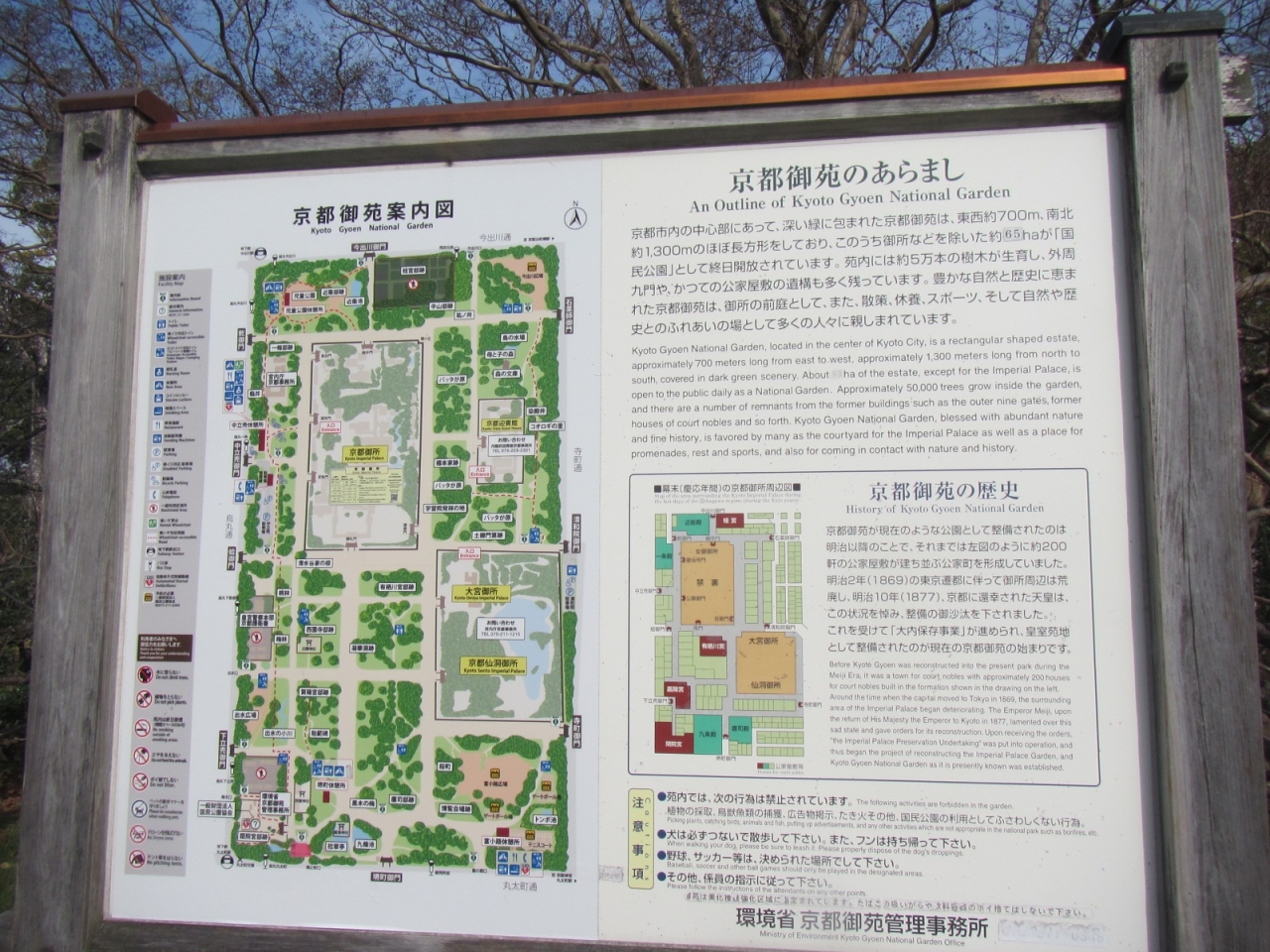 京都御所が目的で訪れましたが、昔の公家の邸宅が立ち並んでいた東西約700m、南北1300m弱もある広大な敷地で、御所までの移動だけでも時間がかかりました。