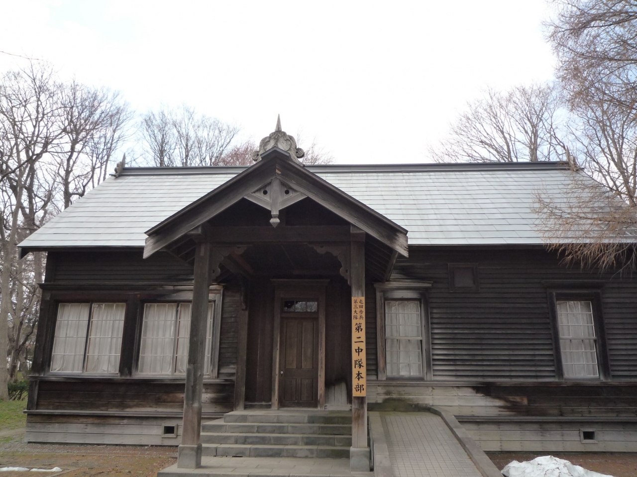 明治17年築の現存する最古の屯田兵の本部建物(官庁建築)で、一部2階建ての天井に梁を渡さない構造が特徴とありました。