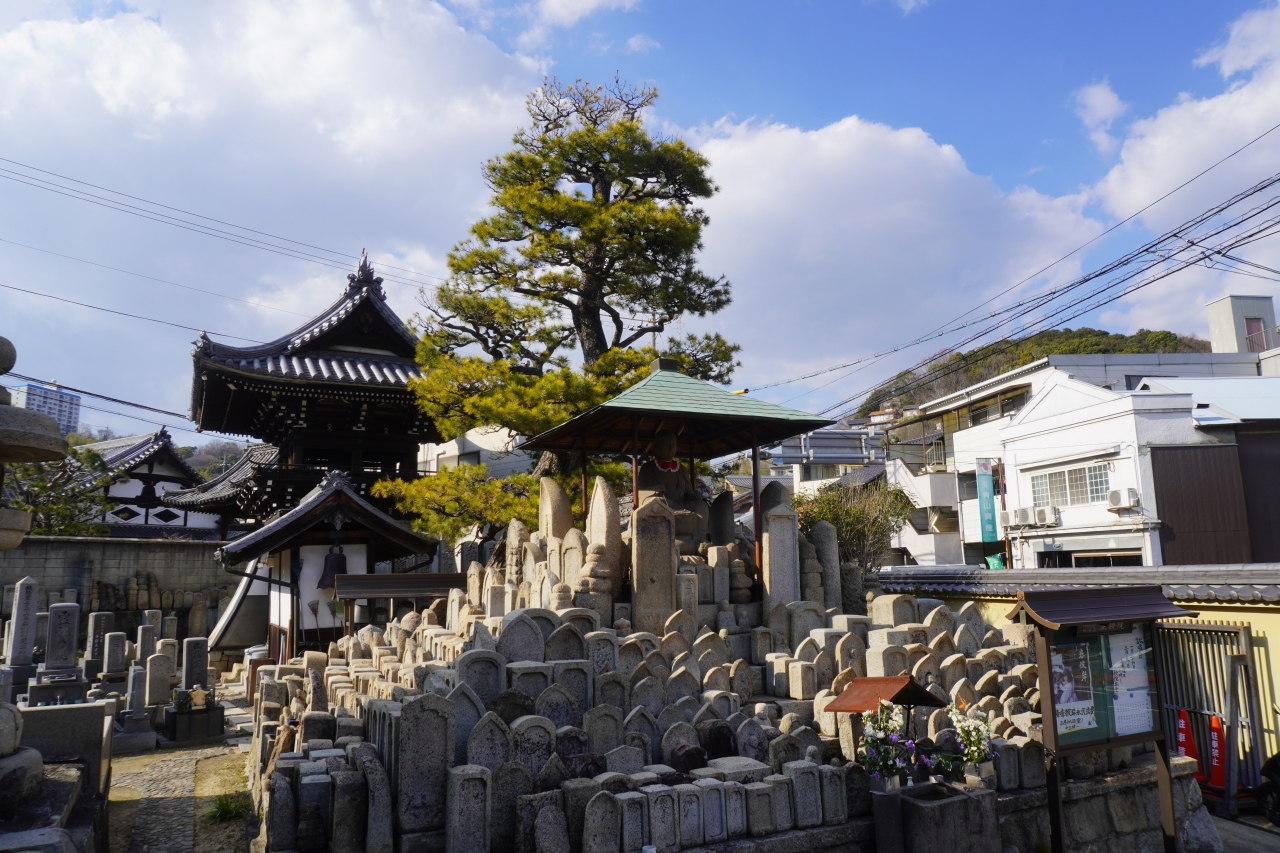 応永元年(1394)に創建された浄土宗のお寺。大通りに面しているし、穏やかな雰囲気がありますが、境内にはこんもりと石材が積み上げられた石造常念物五万日廻向塔。それがちょっとしたポイントです。