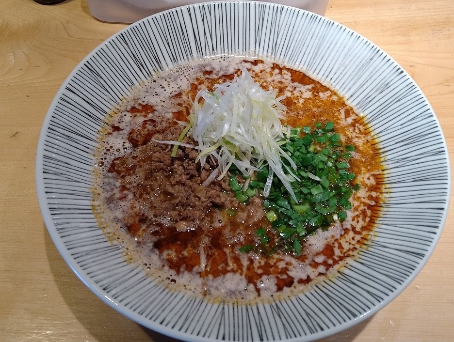 港区西新橋2丁目にある担々麺専門店です。夕食で四川風担々麺をいただきました。やや細めでコシのあるストレート麺の上に肉ミンチ、白髪ネギ、青ネギがのり、ラー油の浮いた少しピリッと辛いスープの一品です。ラー油の辛さと山椒の痺れと独特な旨味を感じ、美味しくいただきました。レベルの高い担々麺の印象です。