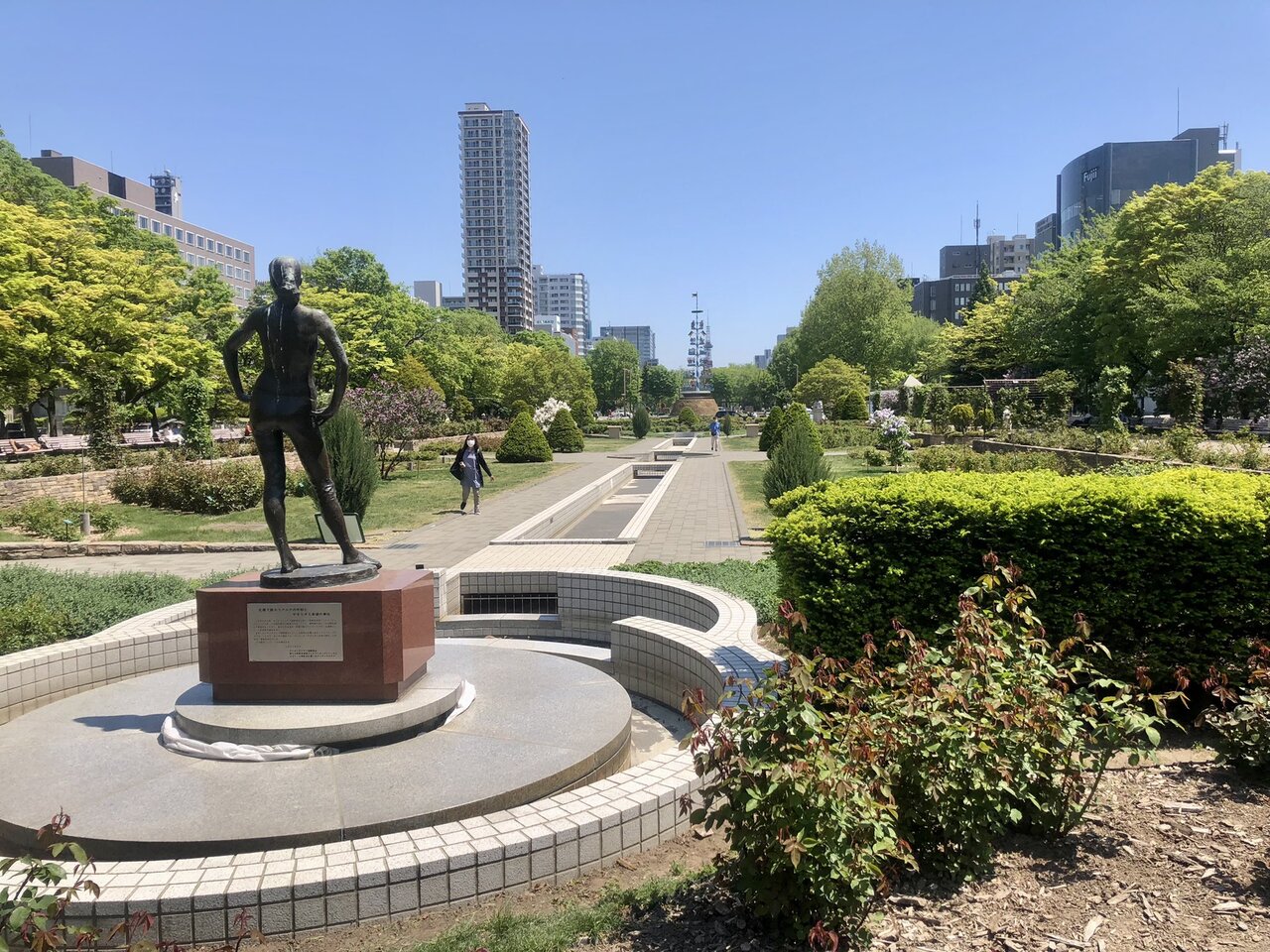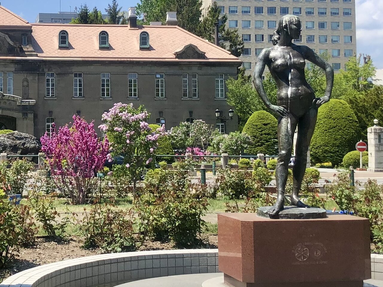 若い女の像は、大通公園の1番西側の札幌資料館の前、バラ園の中にある像で、佐藤忠良氏の作品。モデルは女優で娘の佐藤オリエさんだそうです。札幌資料館を背景に、訪問したのは5月で、まだ薔薇は咲いておらず、ライラックの時期でした。バラが咲き乱れるバラ園の中の像は、さぞかし素敵でしょうね。
