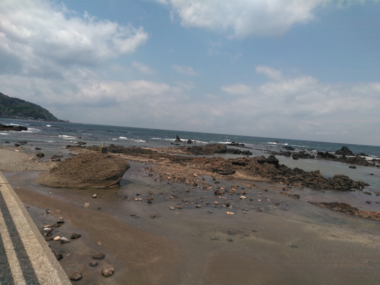 海沿いの道路に「ゴジラ岩」と案内板があって、その前が数台分の無料駐車スペースになっています。目の前の海の中には、いくつもの黒いごつごつした岩がありますが、「ゴジラ岩」という名前から想像する大きさの岩は、すぐには見つかりませんでした。形は似ていますが、とても小さい物がありました。