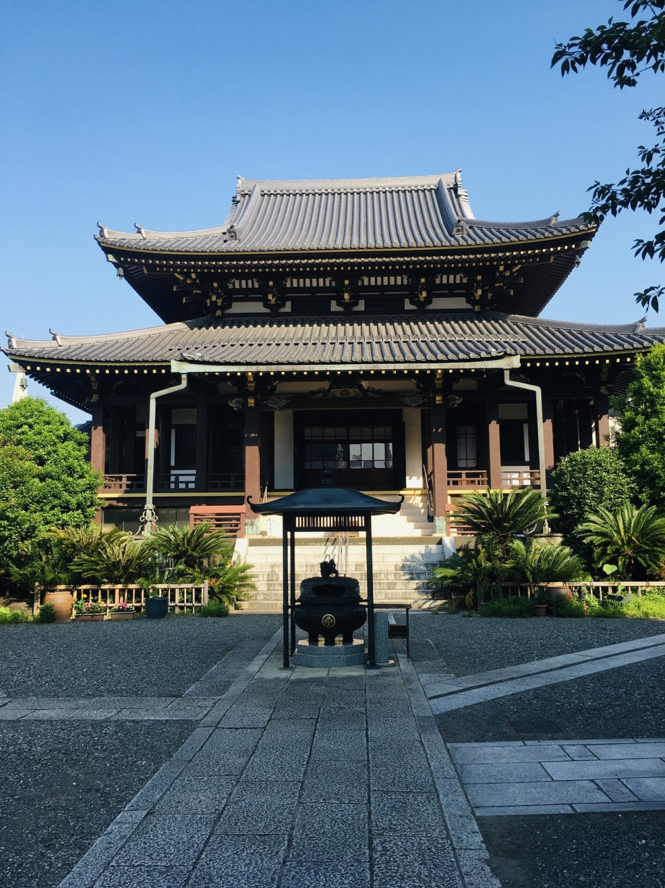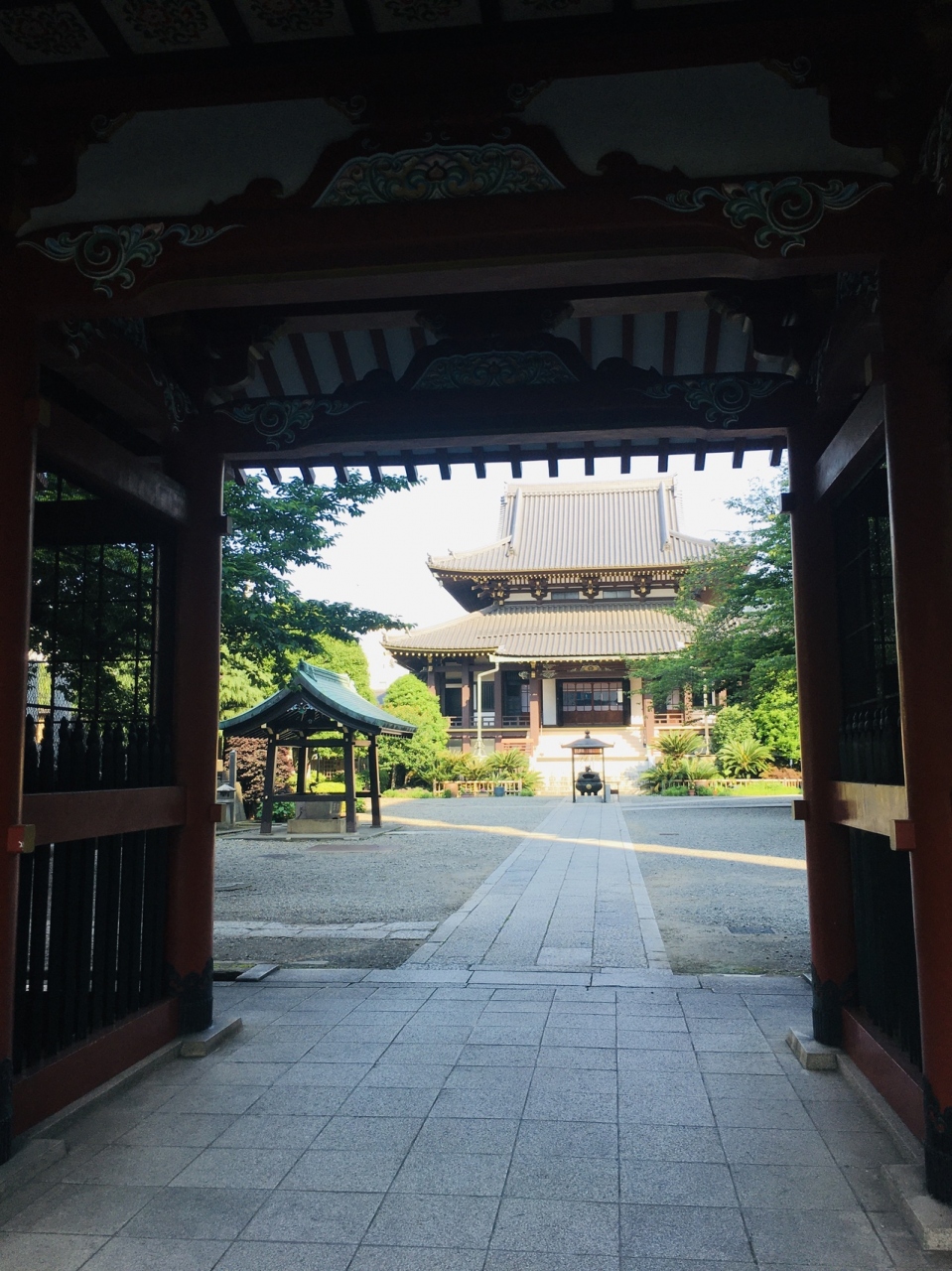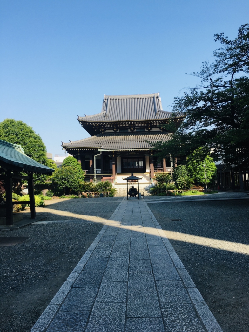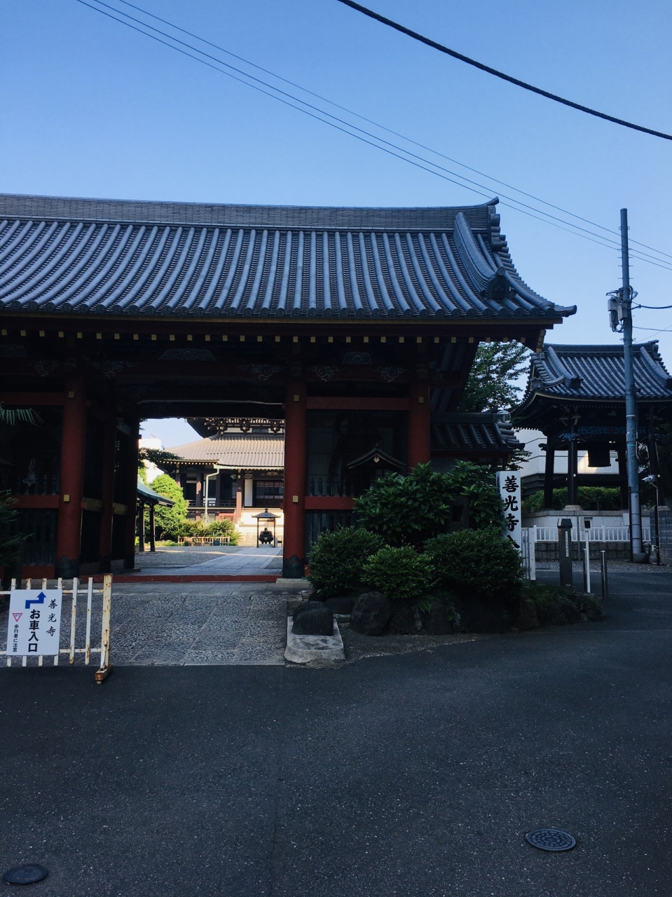 青山通りからほんの少し逸れたところにありました。門には仁王像が配置され境内右側には大きな鐘がありました。正面には長野善光寺のそっくりな本堂がありましたが小さめでした。ビルに囲まれたような境内でしたが静かな寺でした。