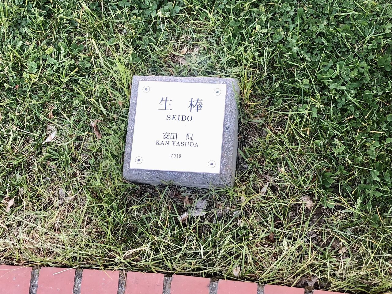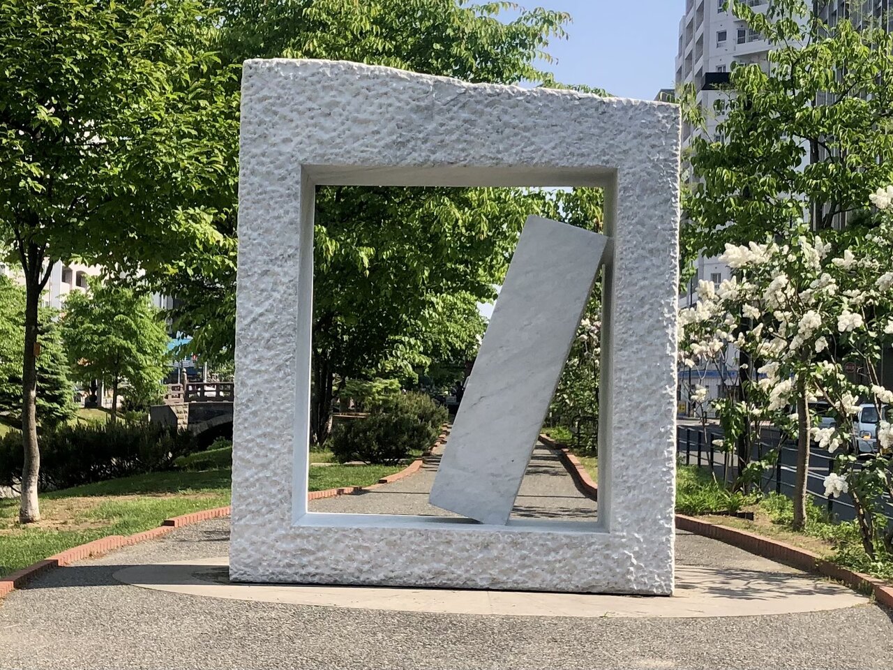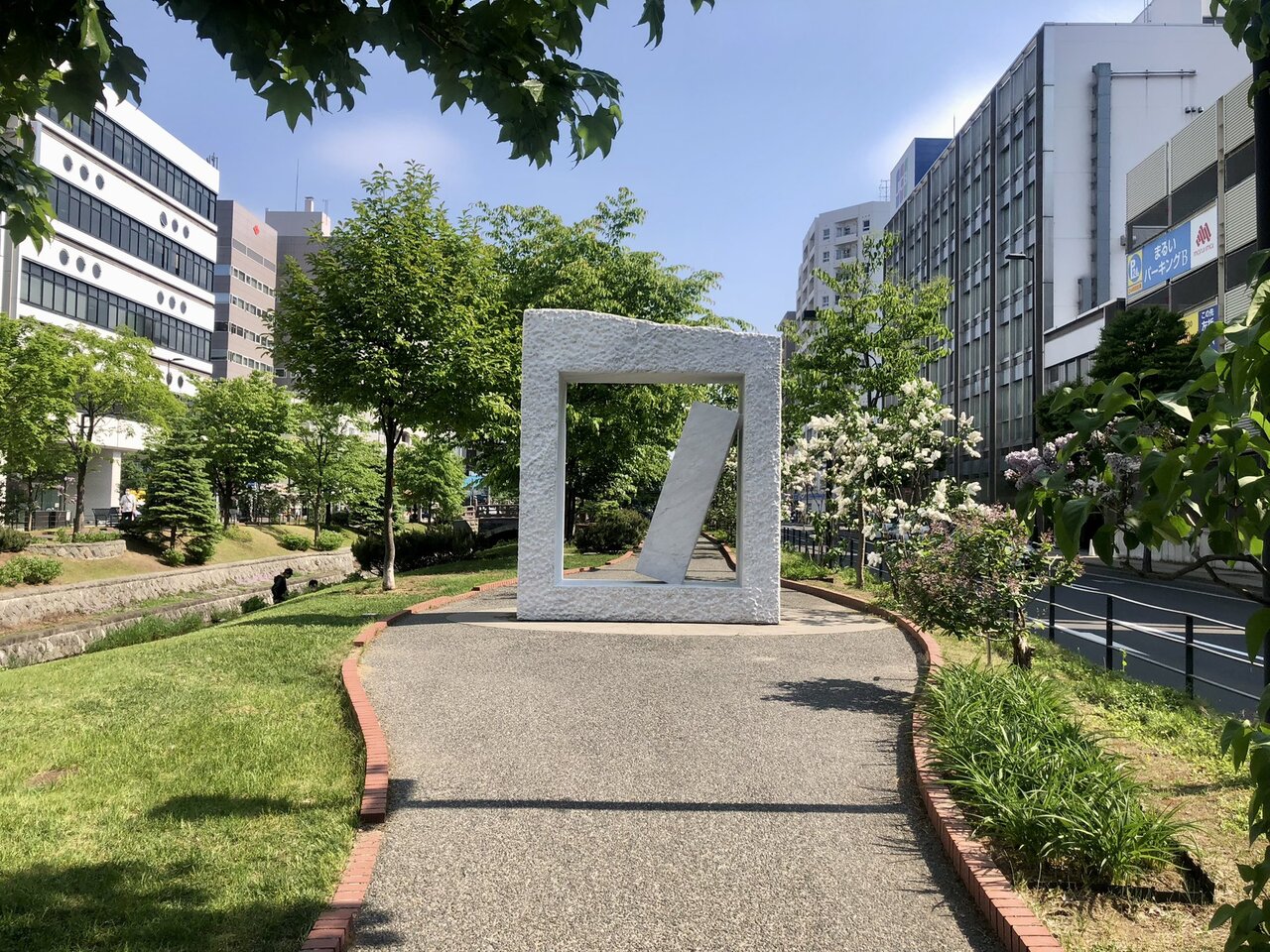 成川公園の中には、安田侃と言う彫刻家の作品が数点、展示されています。北海道美唄市に生まれ育ち、現在はイタリア在住だそうです。テレビ塔方面から来て、最初に目にしたのは、歩道の真ん中にある作品「生棒」これは人生を支える杖を表しているそうです。野外展示なので、触っても良いそうです。