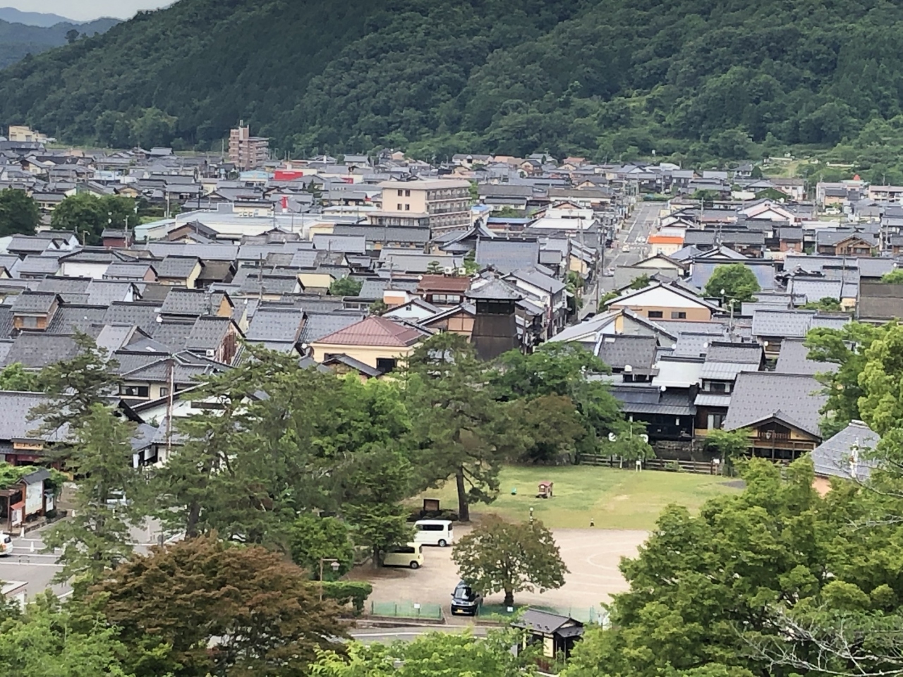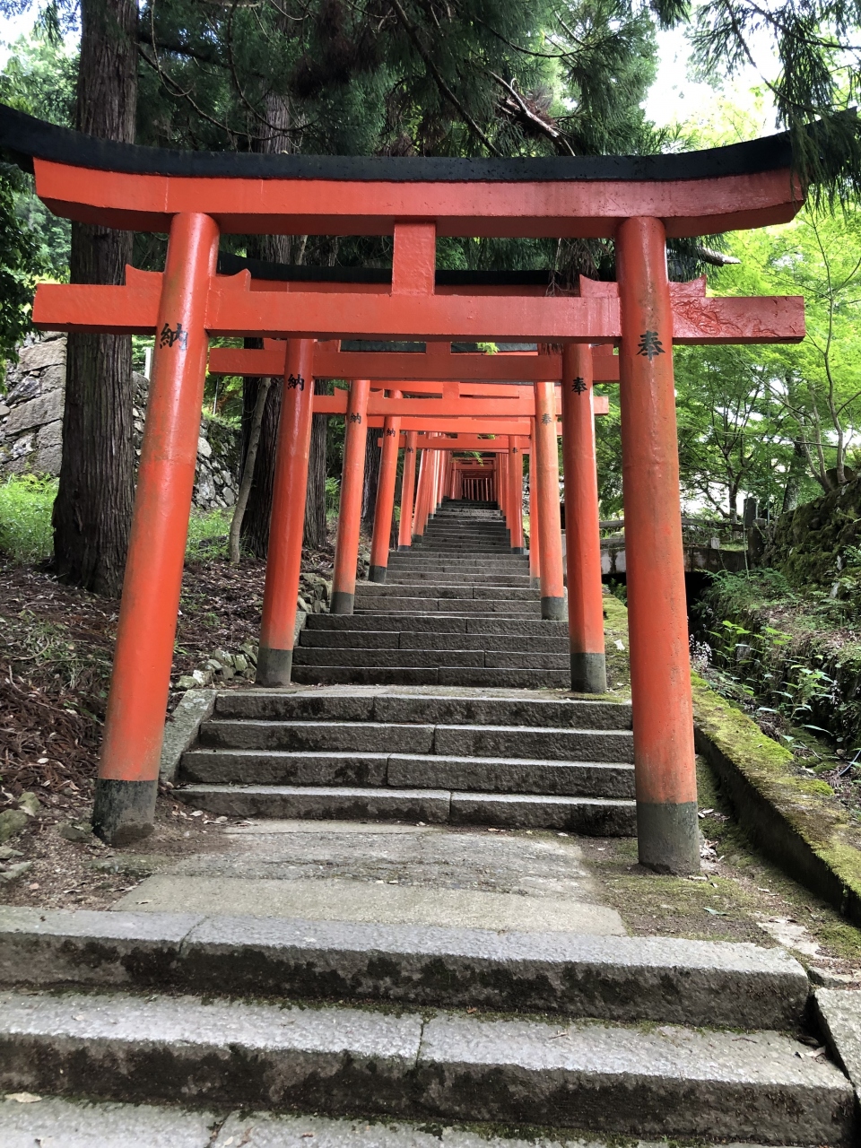 参道は出石城の登城門より左手にあり、150段くらいの石段を上ることになりますが、京都伏見稲荷を思い出させるような朱塗りの鳥居が立ち並びます。階段を上って右手に稲荷神社の本殿があります。ここに参拝してから、本殿の右側の広場から出石の町並みがきれいに見えます。天守閣がなかった出石城は天守閣代わりにこの稲荷神社を利用していたそうです。