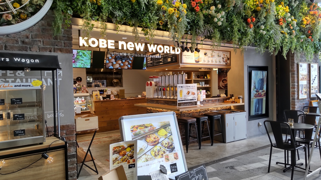 KOBE new WORLDは、阪急三宮駅西口直ぐのところにあります。以前にマクドナルドがあった場所に2021年4月にオープンしたお洒落な感じのデリ&カフェ&レストランです。1Fは、テイクアウト専門店(イートインコーナーあり)、2Fはカフェ&レストランとなっています。クラフトコーラで一休みです。天然スパイスを使用した体に優しいドリンクです。