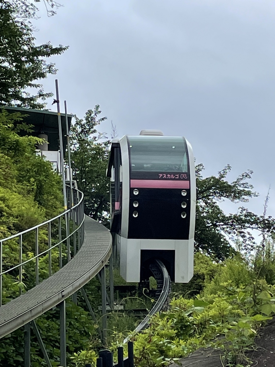 王子駅前から飛鳥山公園に登る無料のモノレールです。休日の午后に下りで利用しました。公園遊びの家族連れでちょっとした行列です。スタッフが乗り場で誘導、満員で出発しました。乗車時間はわずか75秒ほどでした。