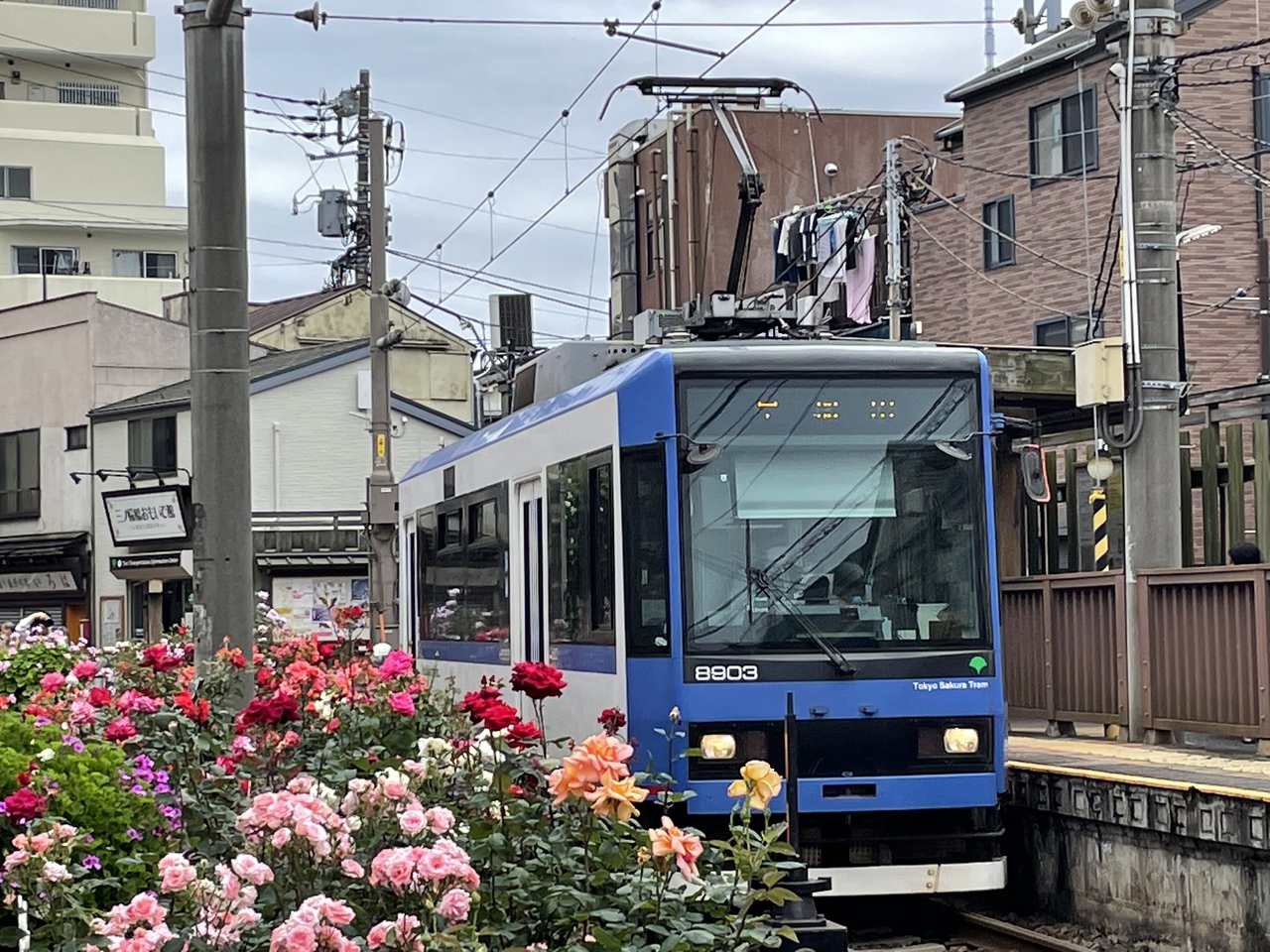 5月中旬の休日に訪れました。三ノ輪橋電停付近と次の荒川一中前までの沿線にはきれいなバラの花が満開で、沿線でカメラを向ける人も多くみられました。線路と並行するアーケード商店街のジョイフル三ノ輪も賑わっていました。